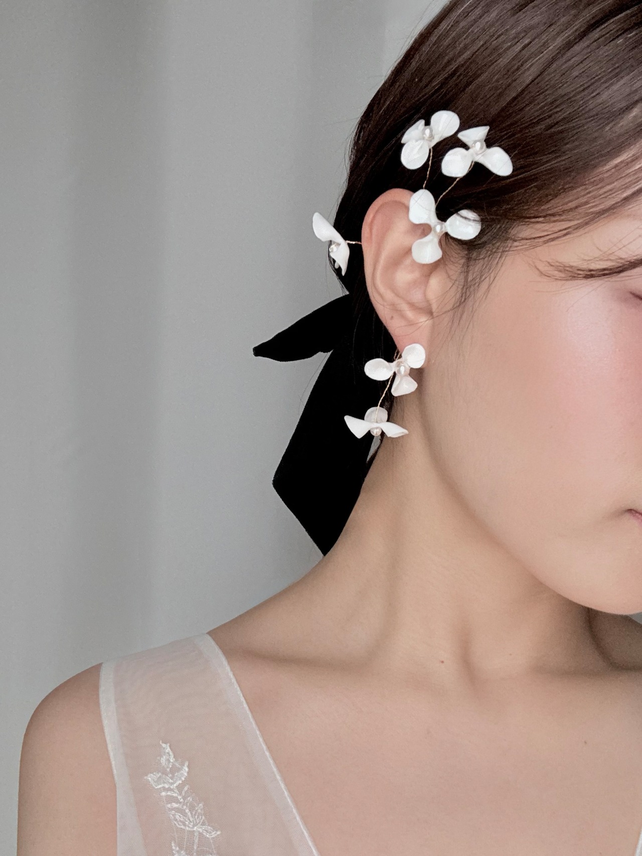 陶磁器のような質感のお花がお顔まわりで咲くようなイヤカフです