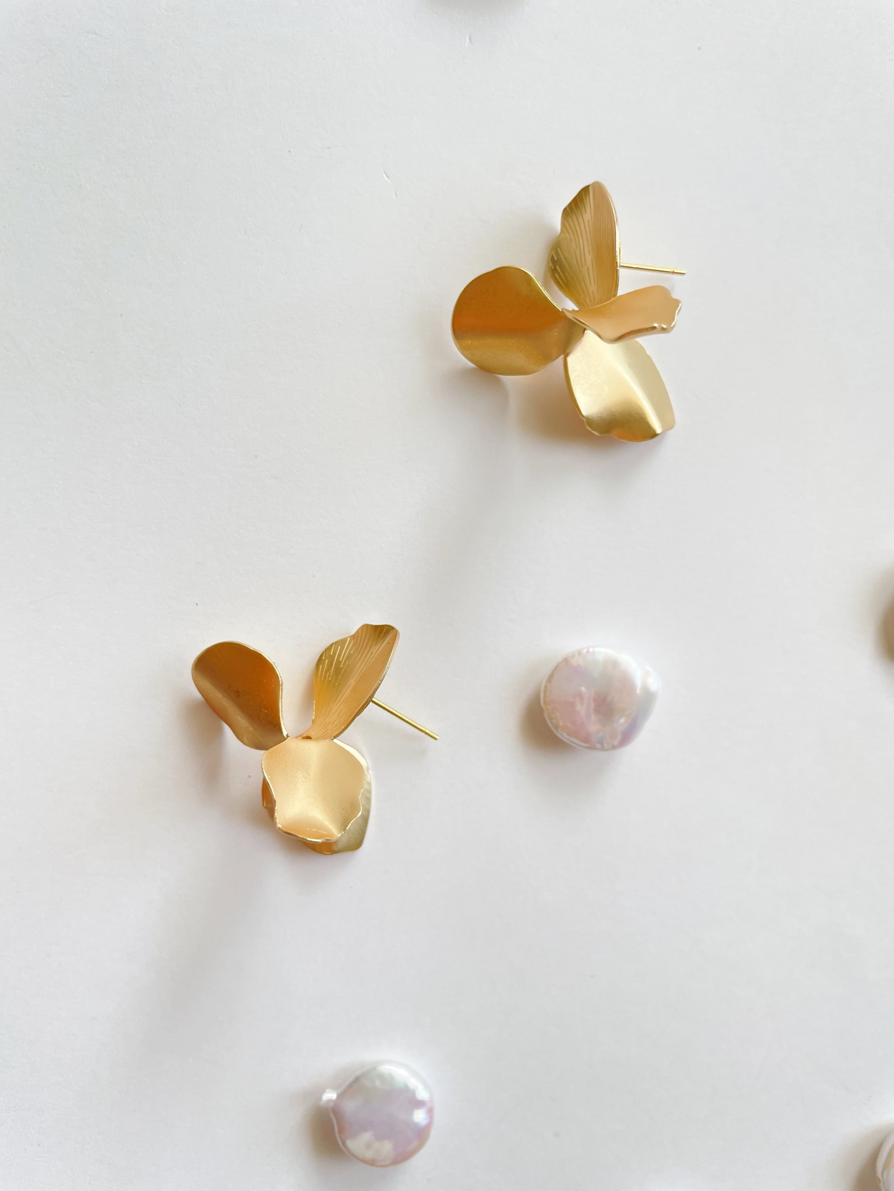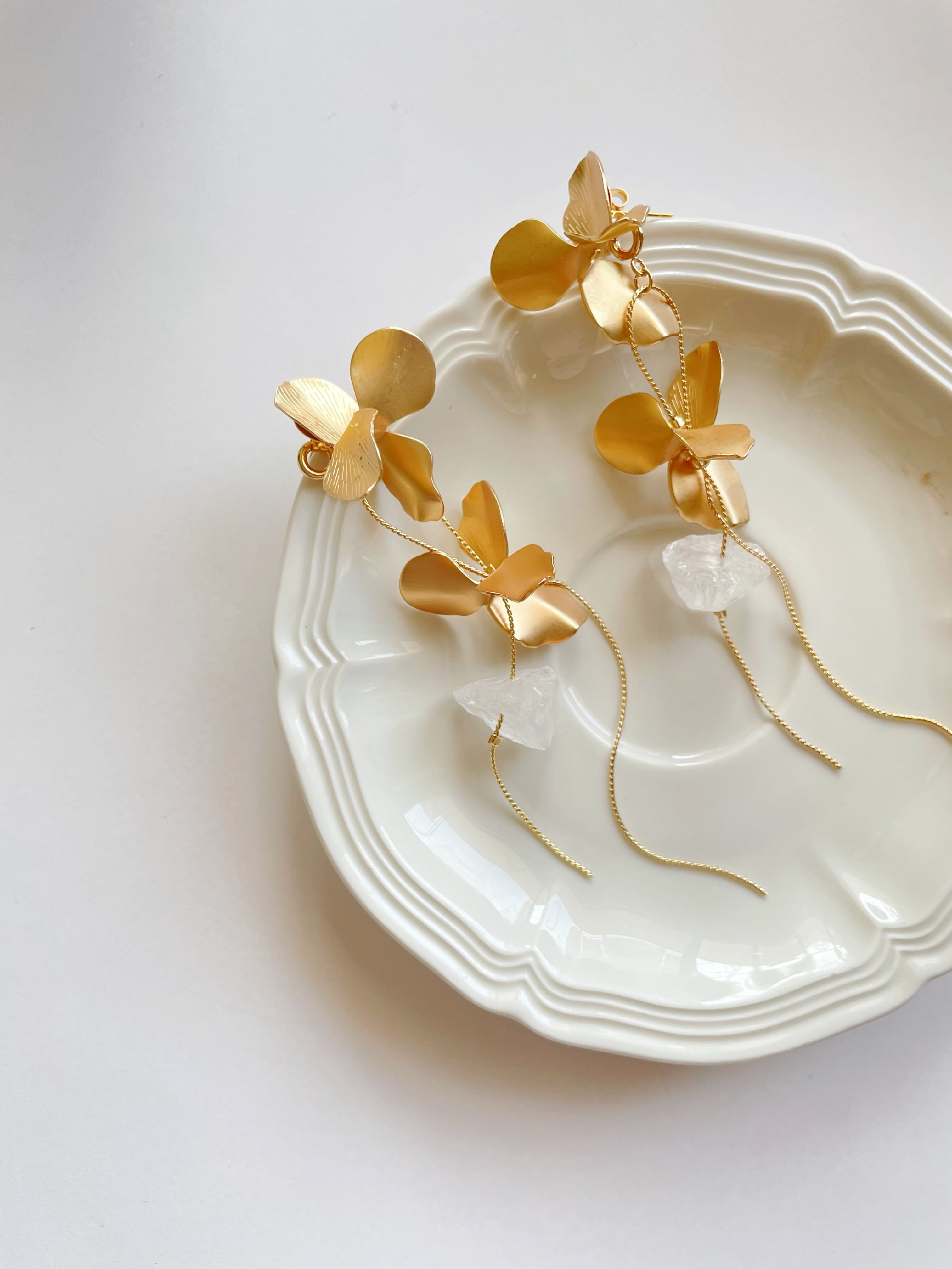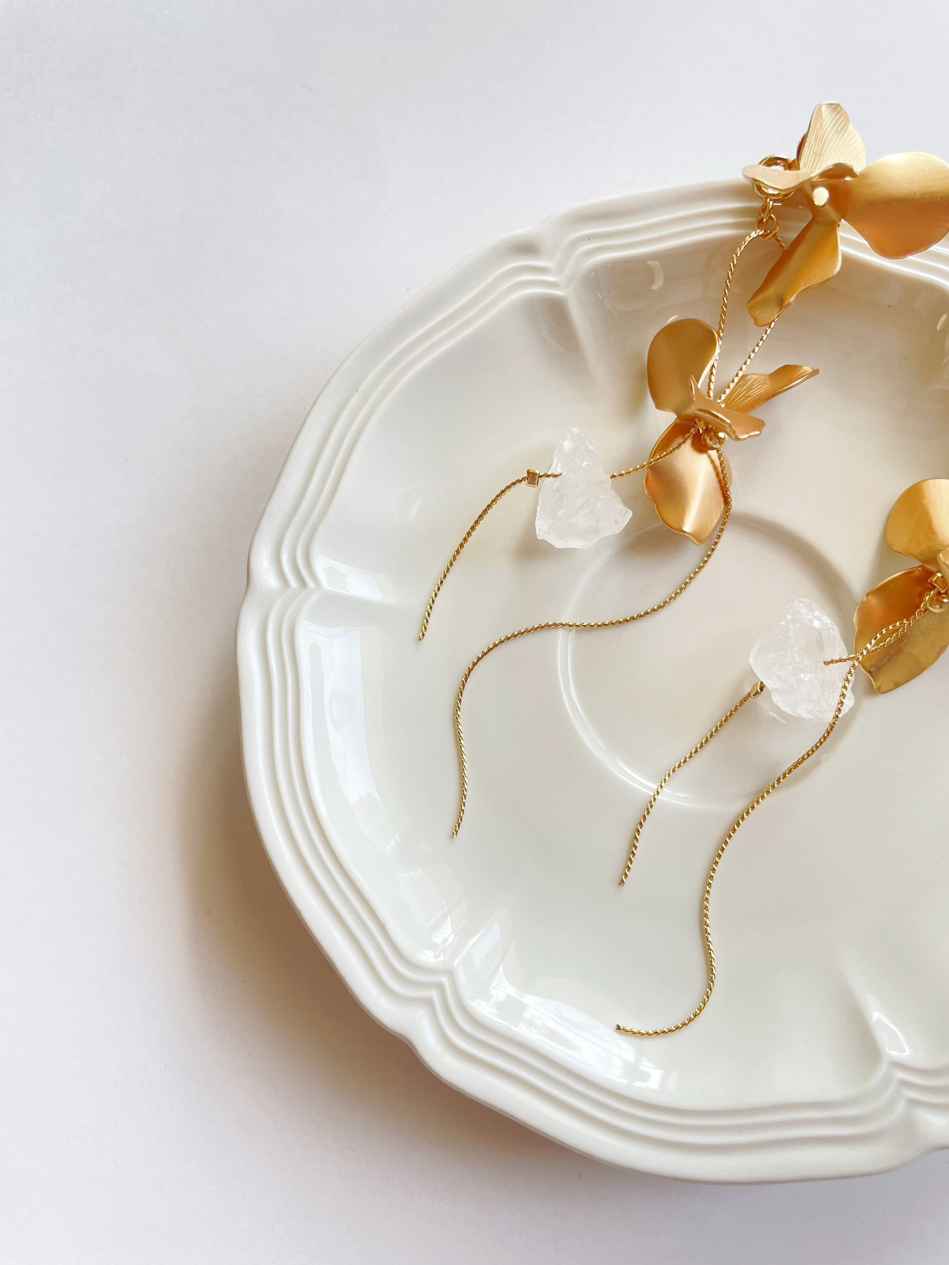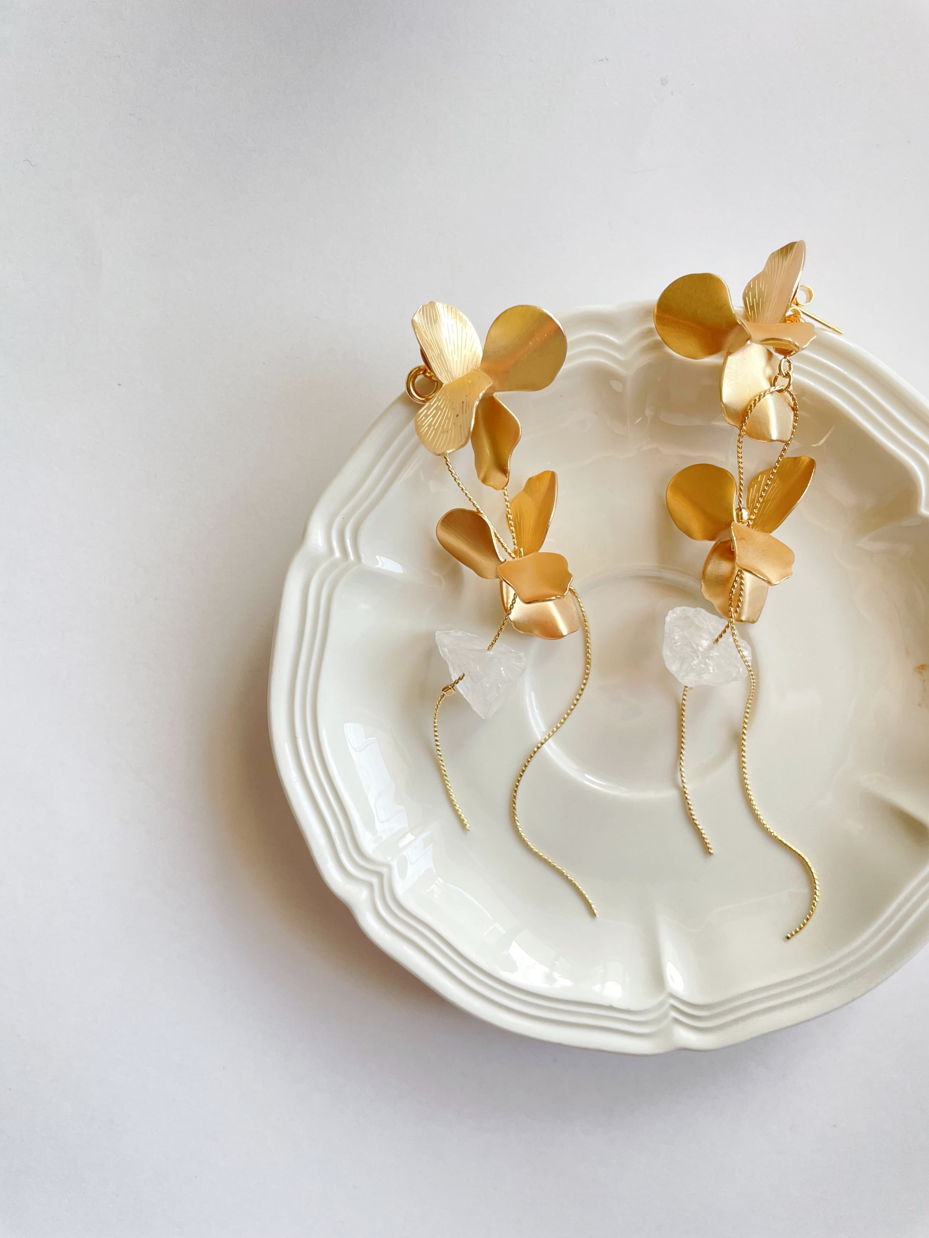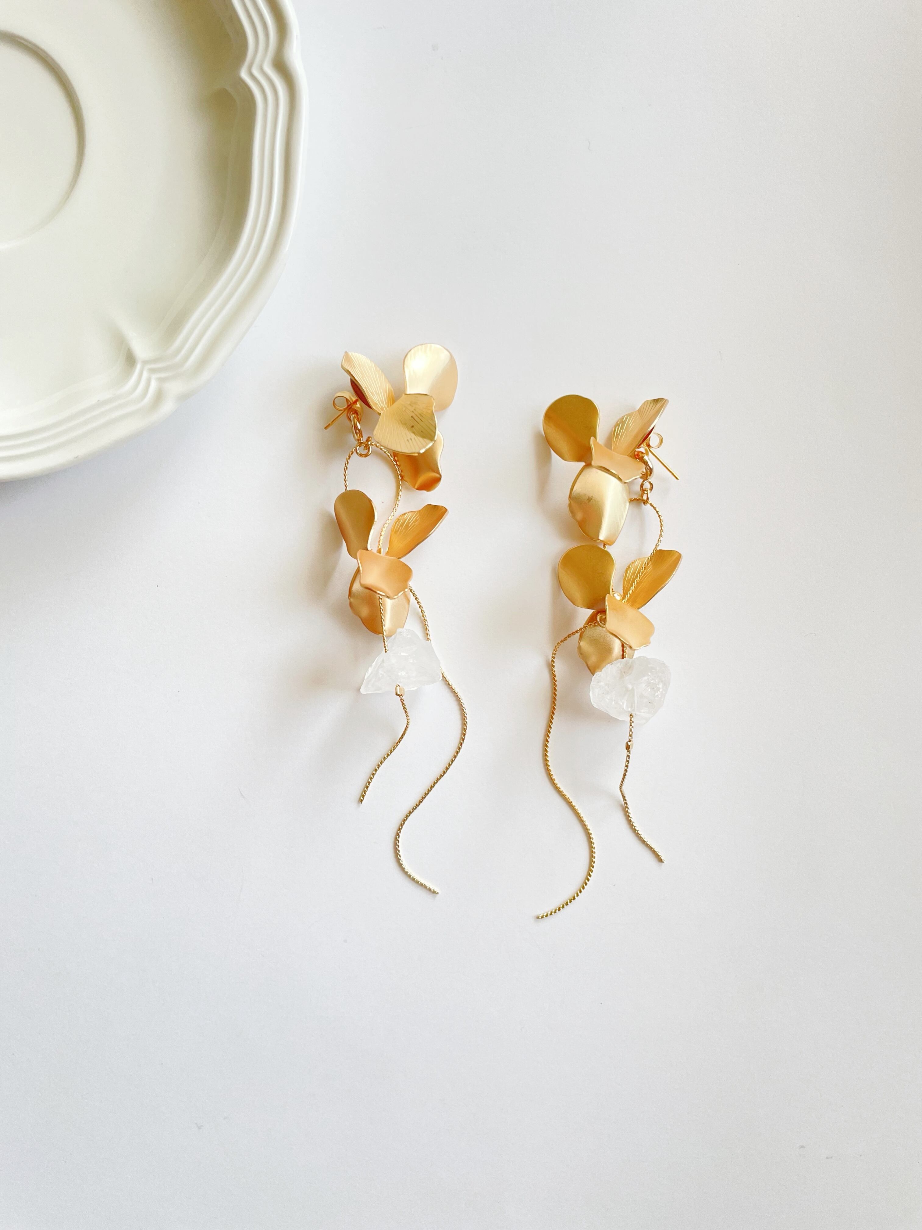 マットゴールドのフラワーと、ラフな質感が素敵な天然石を、肌馴染みのいい華奢なゴールドチェーンで繋ぎました