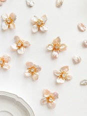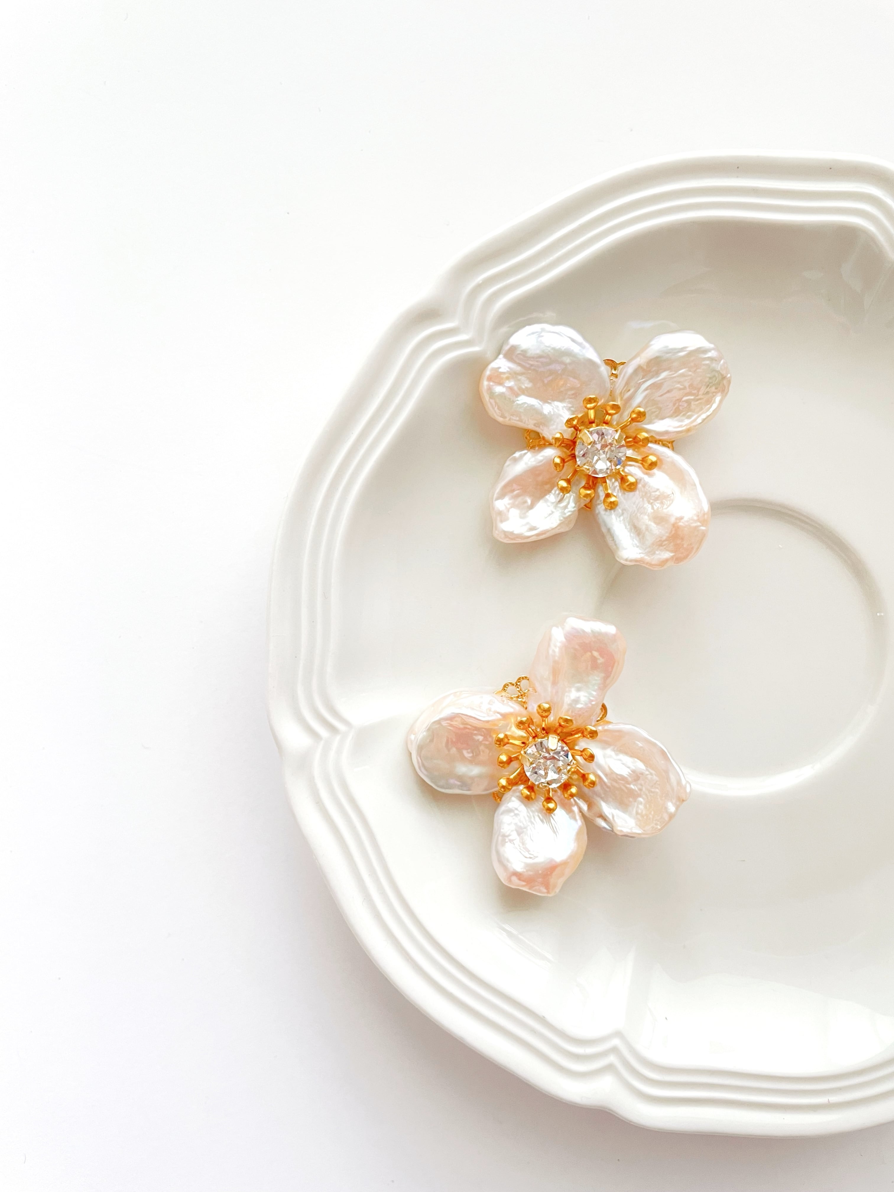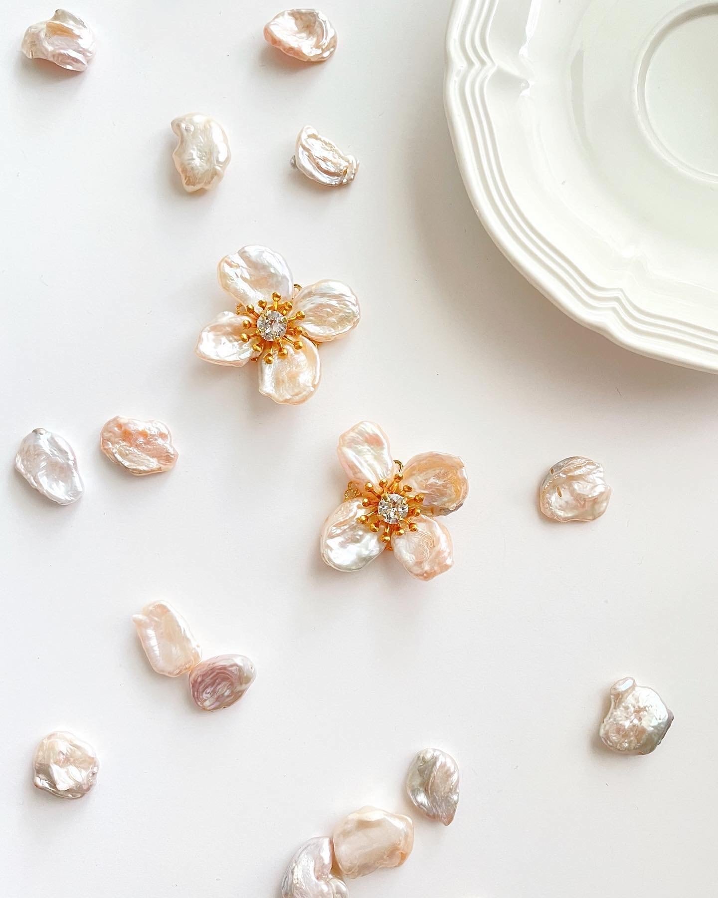 淡い桜色の淡水パールはお色味が絶妙で、肌に馴染みやすく、お耳元にポイントを持たせつつ、ふんわりとした優しげな雰囲気に。