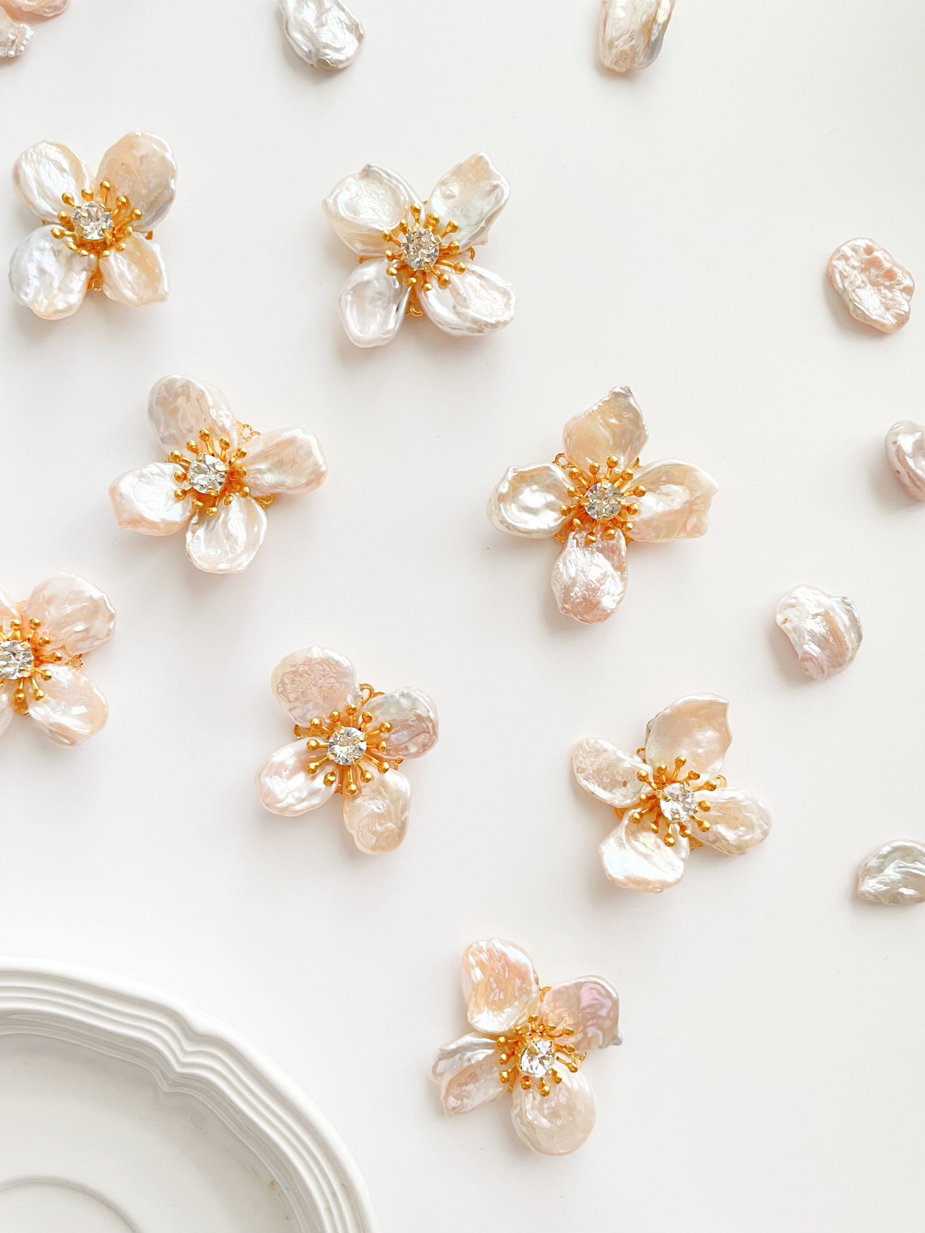 桜色の淡水パールを、バランスを見ながら一番可愛くなる組み合わせを見つけ、一つ一つ手作業で編んでおります。