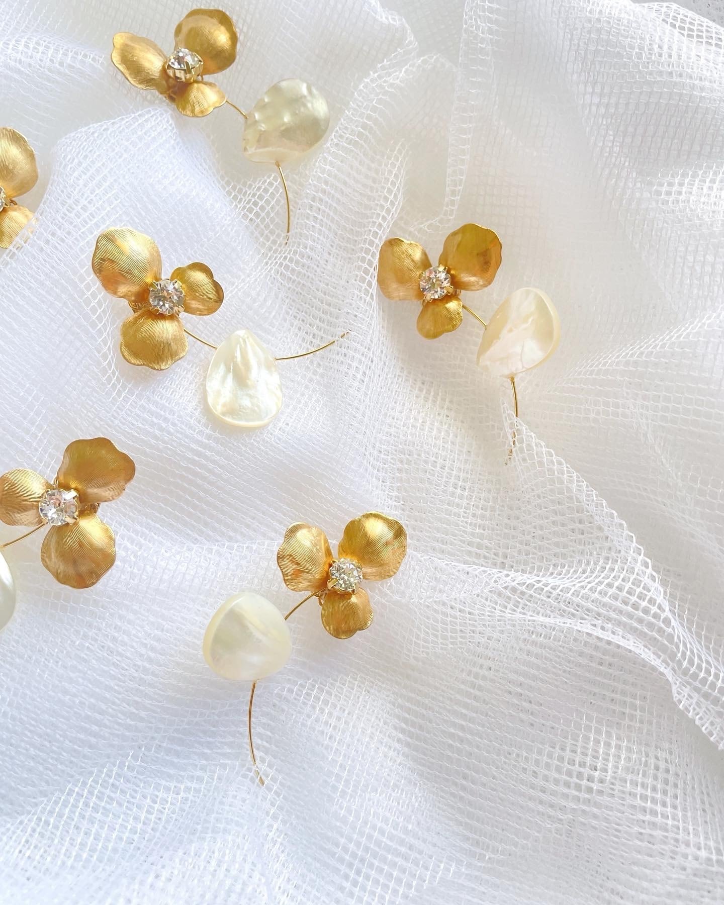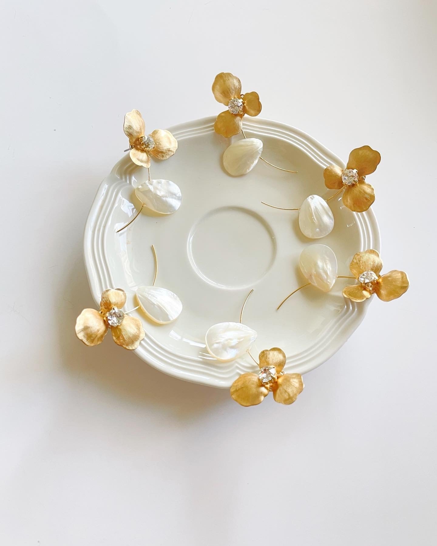 真鍮のフラワーを使用し、繊細さの中にも存在感のあるアクセサリーに仕上げました