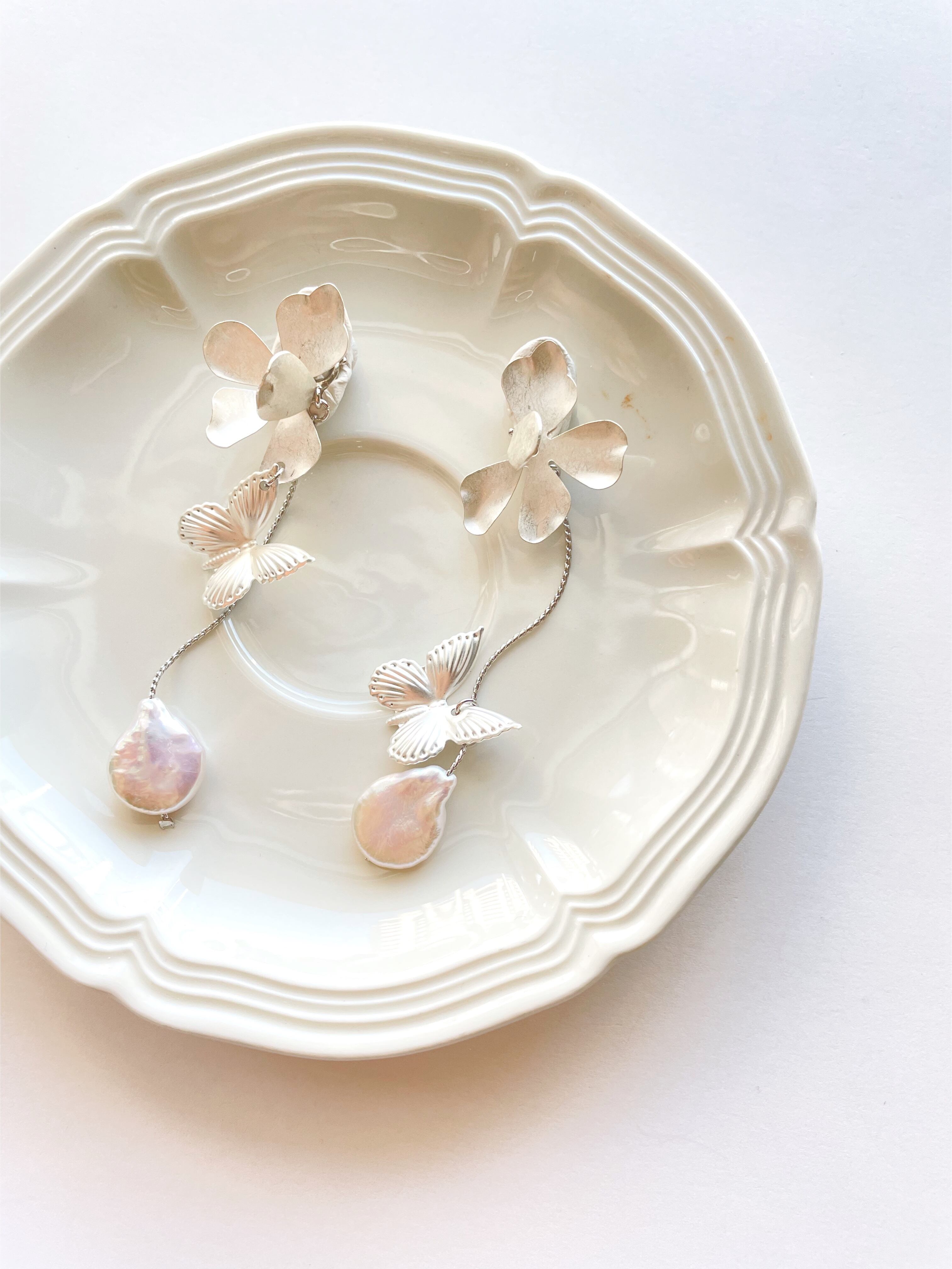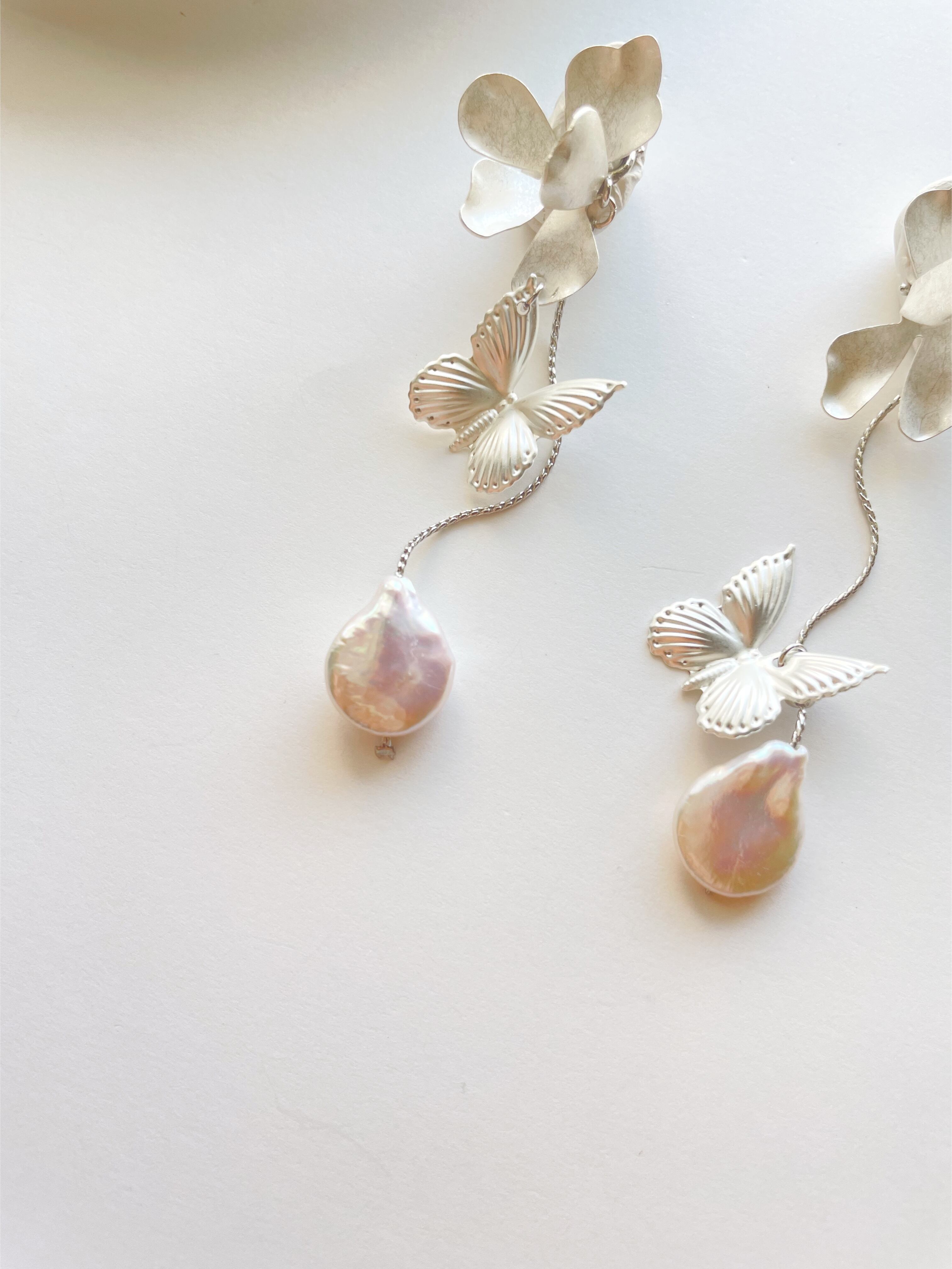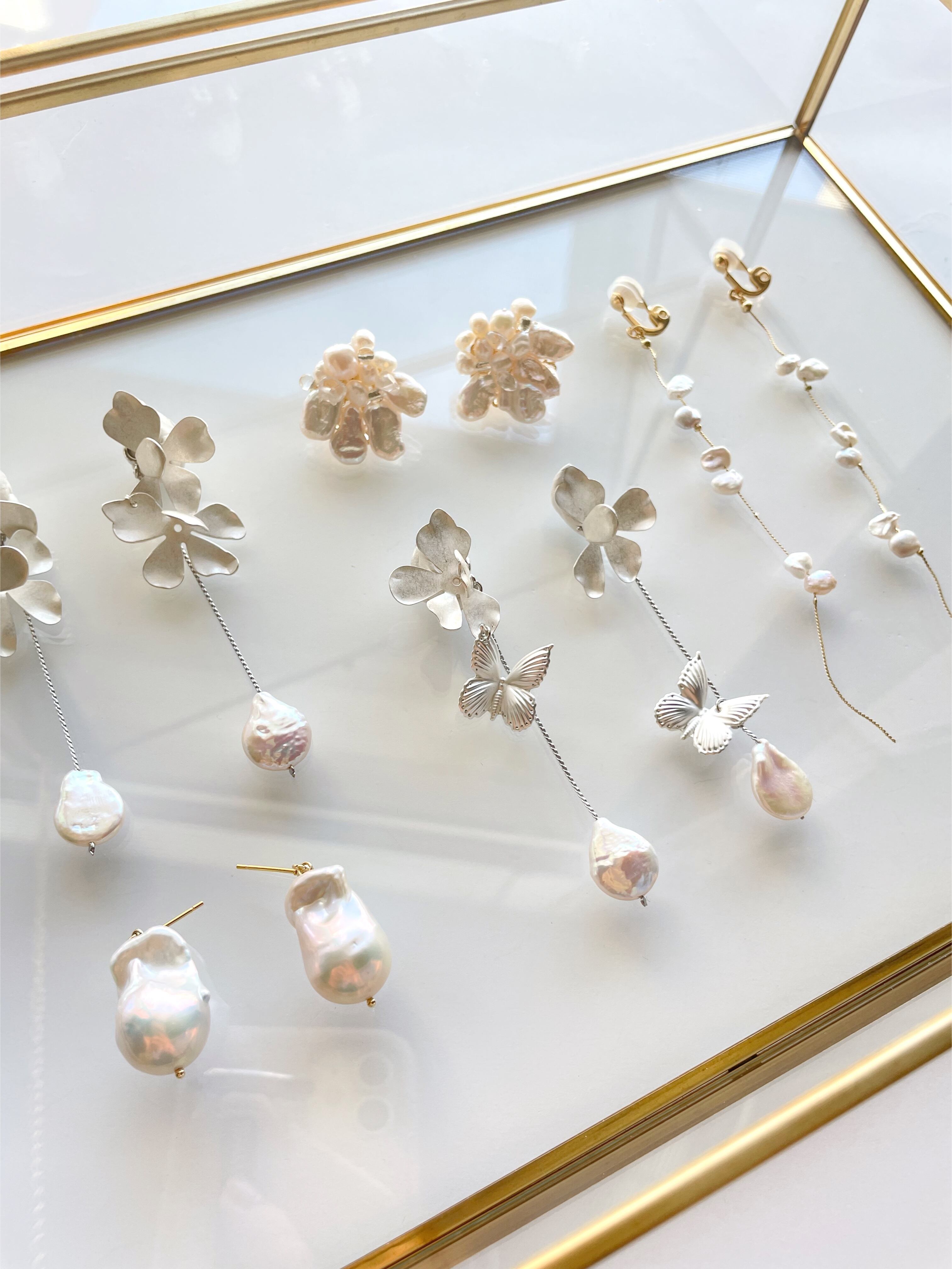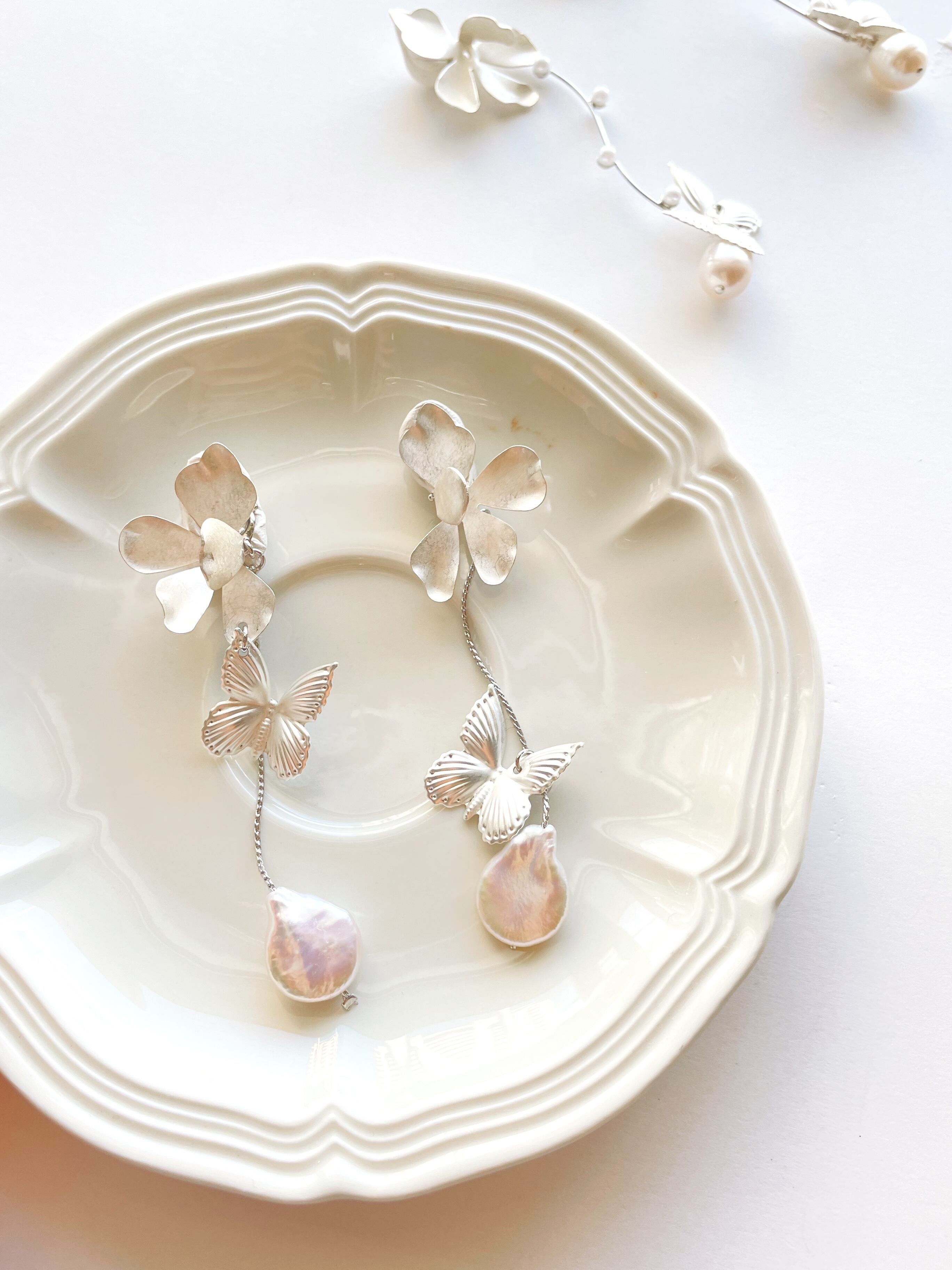 マットシルバーの蝶々と淡水パールのアクセサリー。