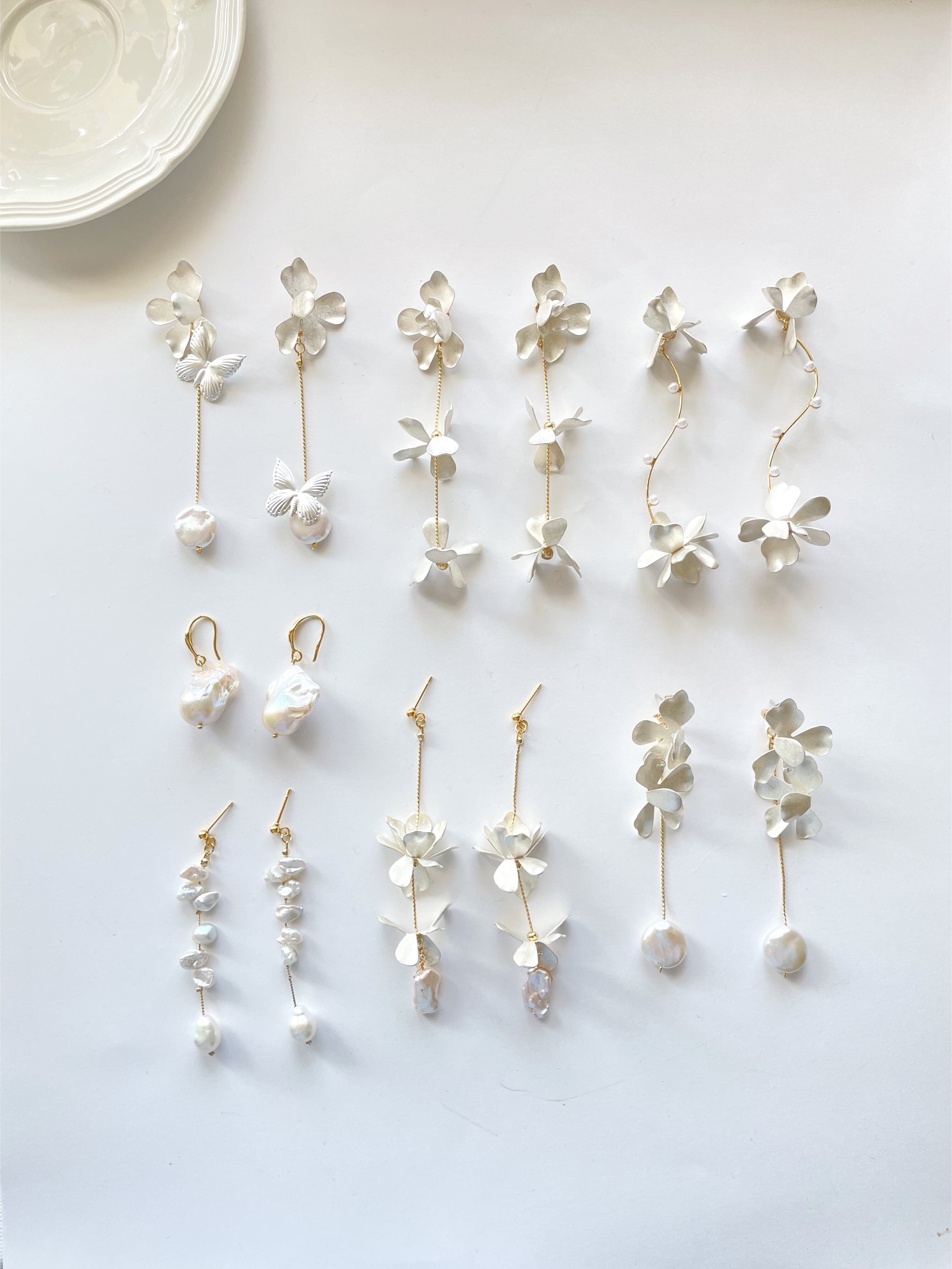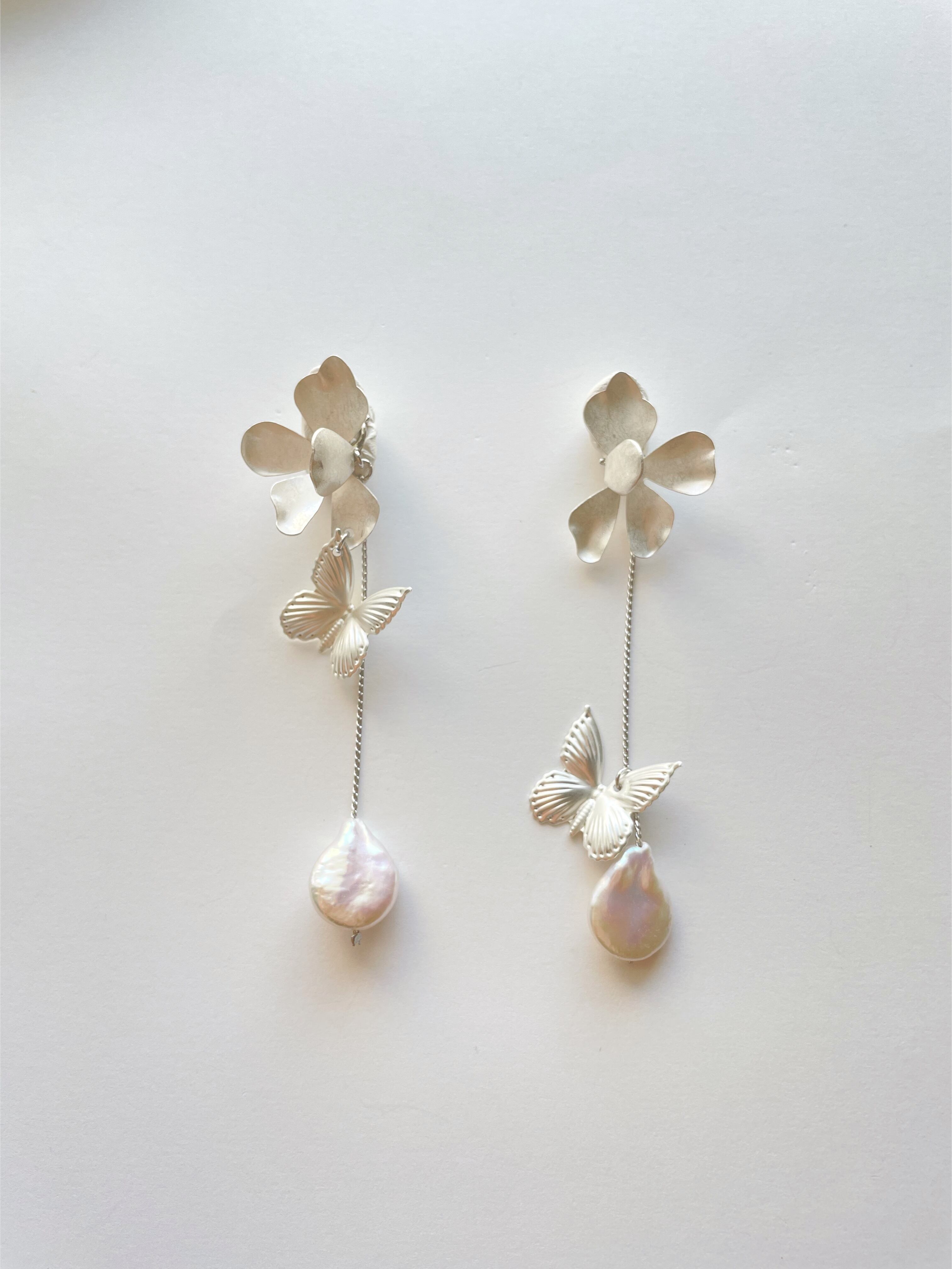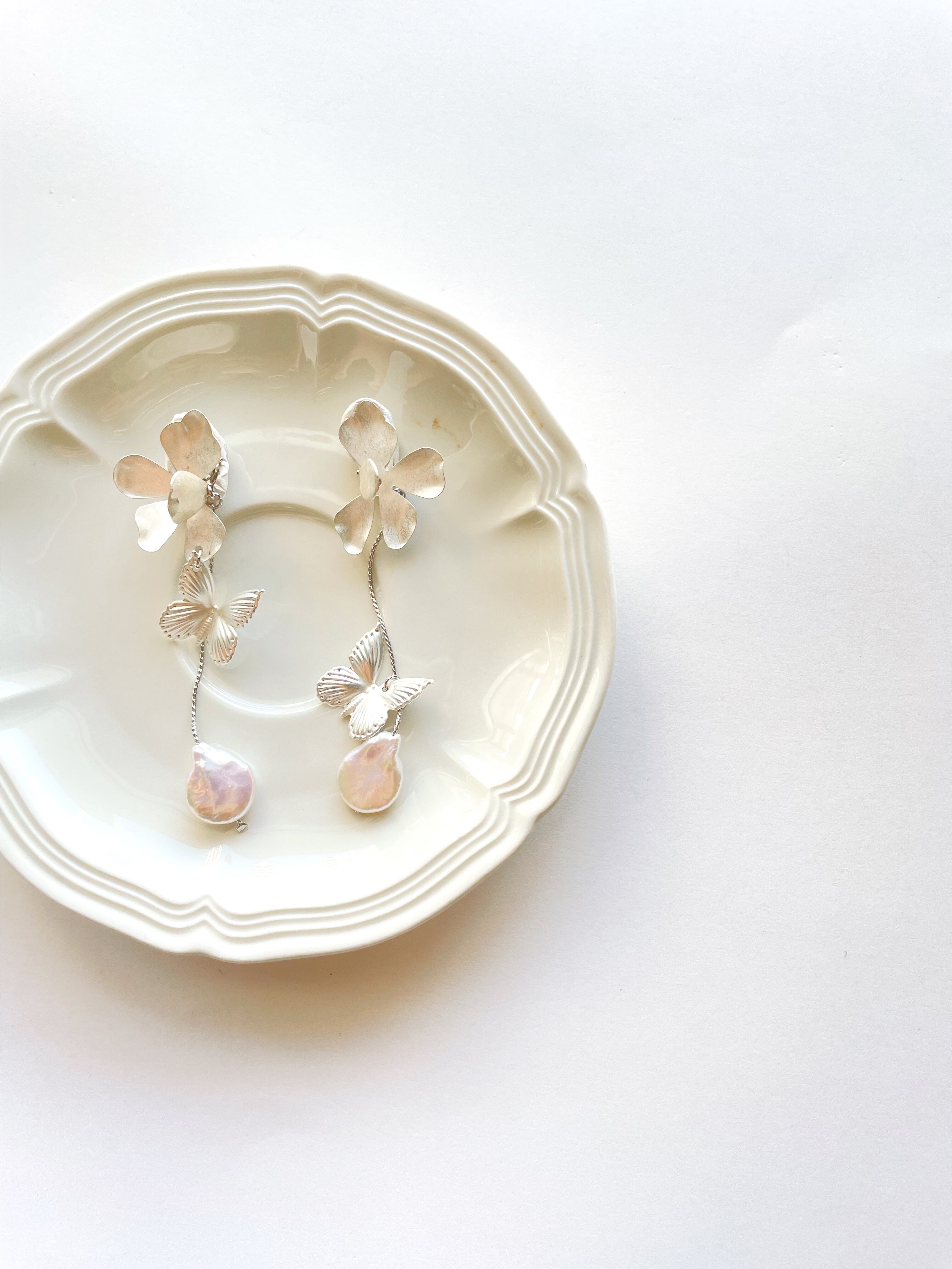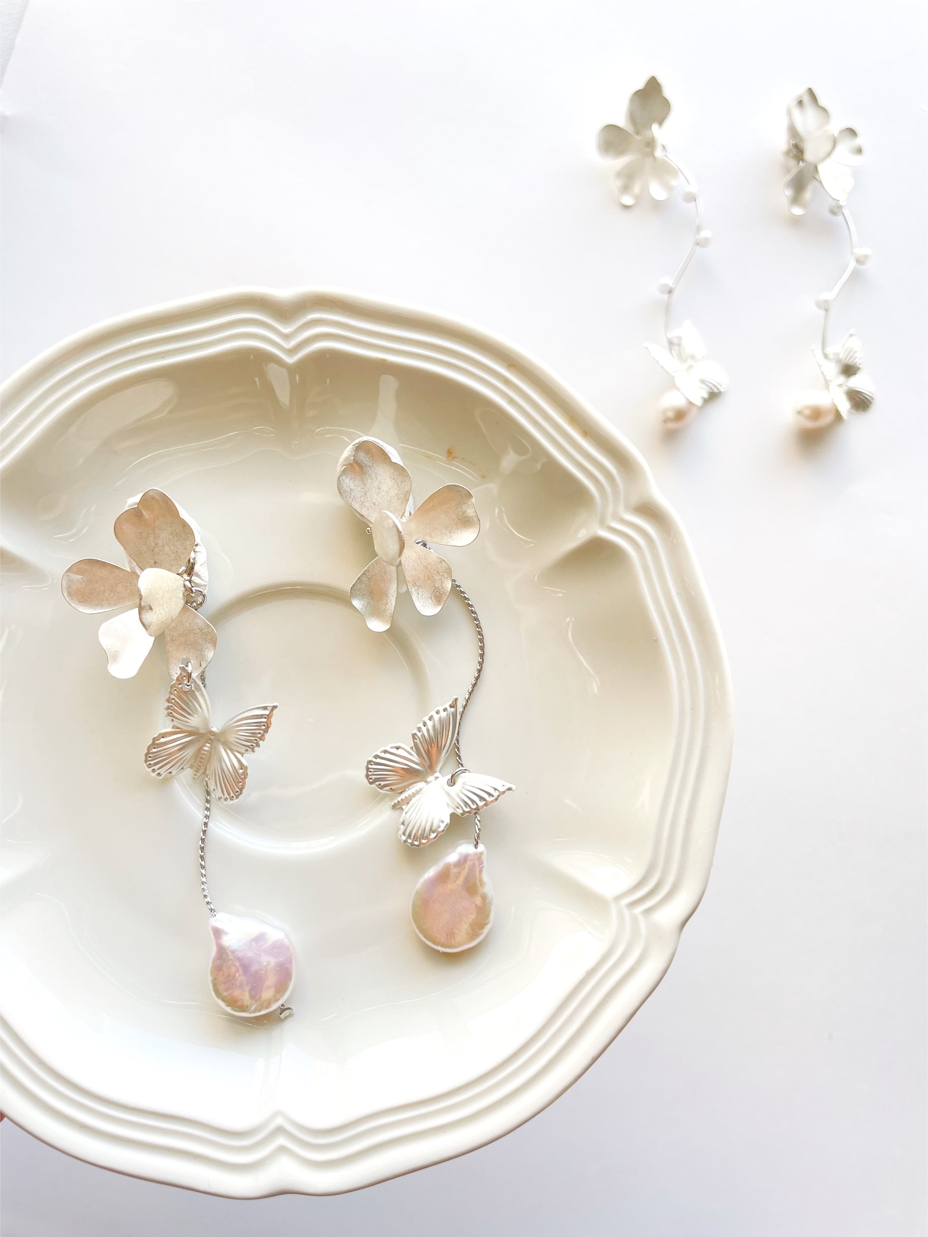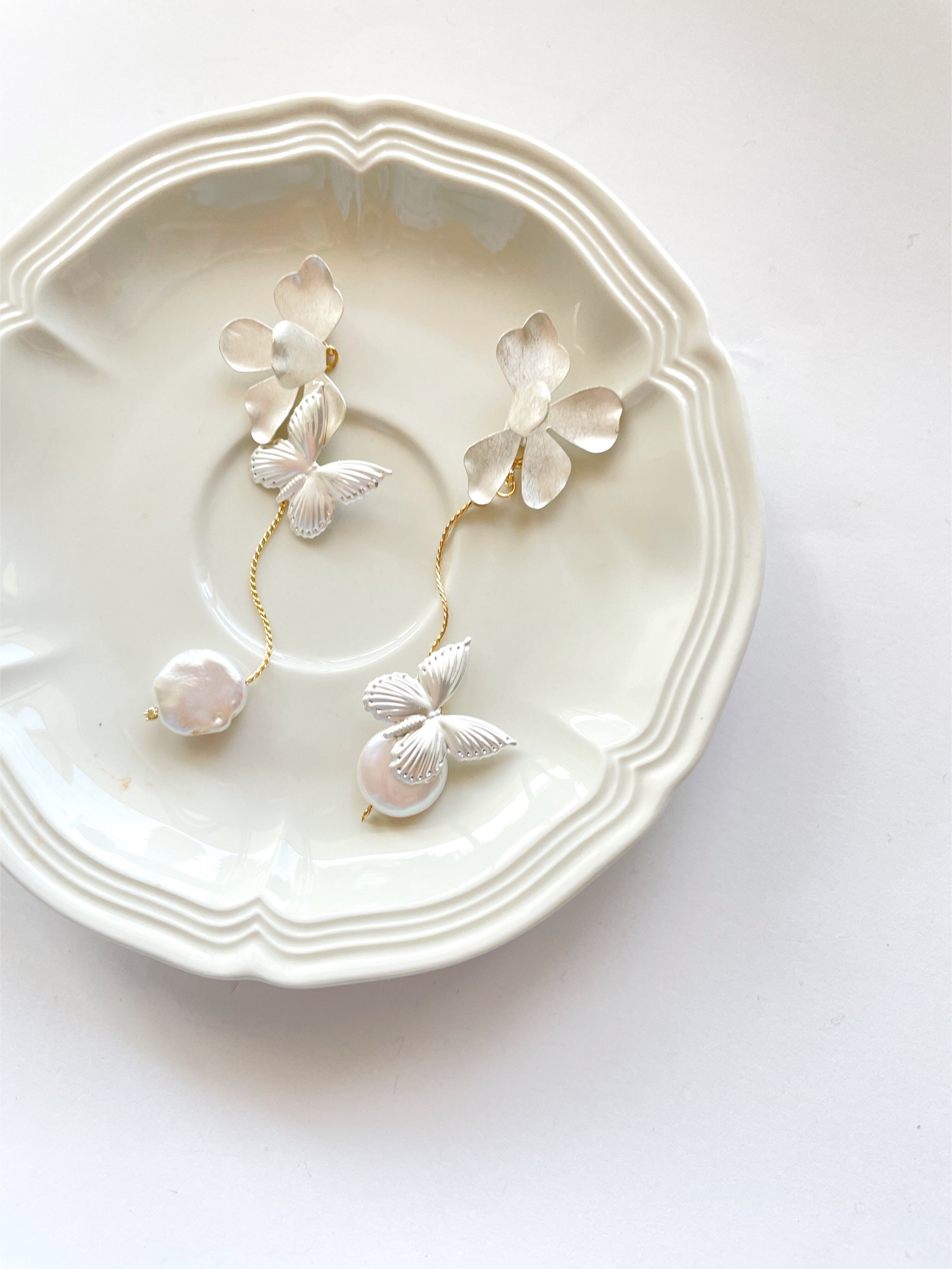 マットシルバーの蝶々と淡水パールのアクセサリー。