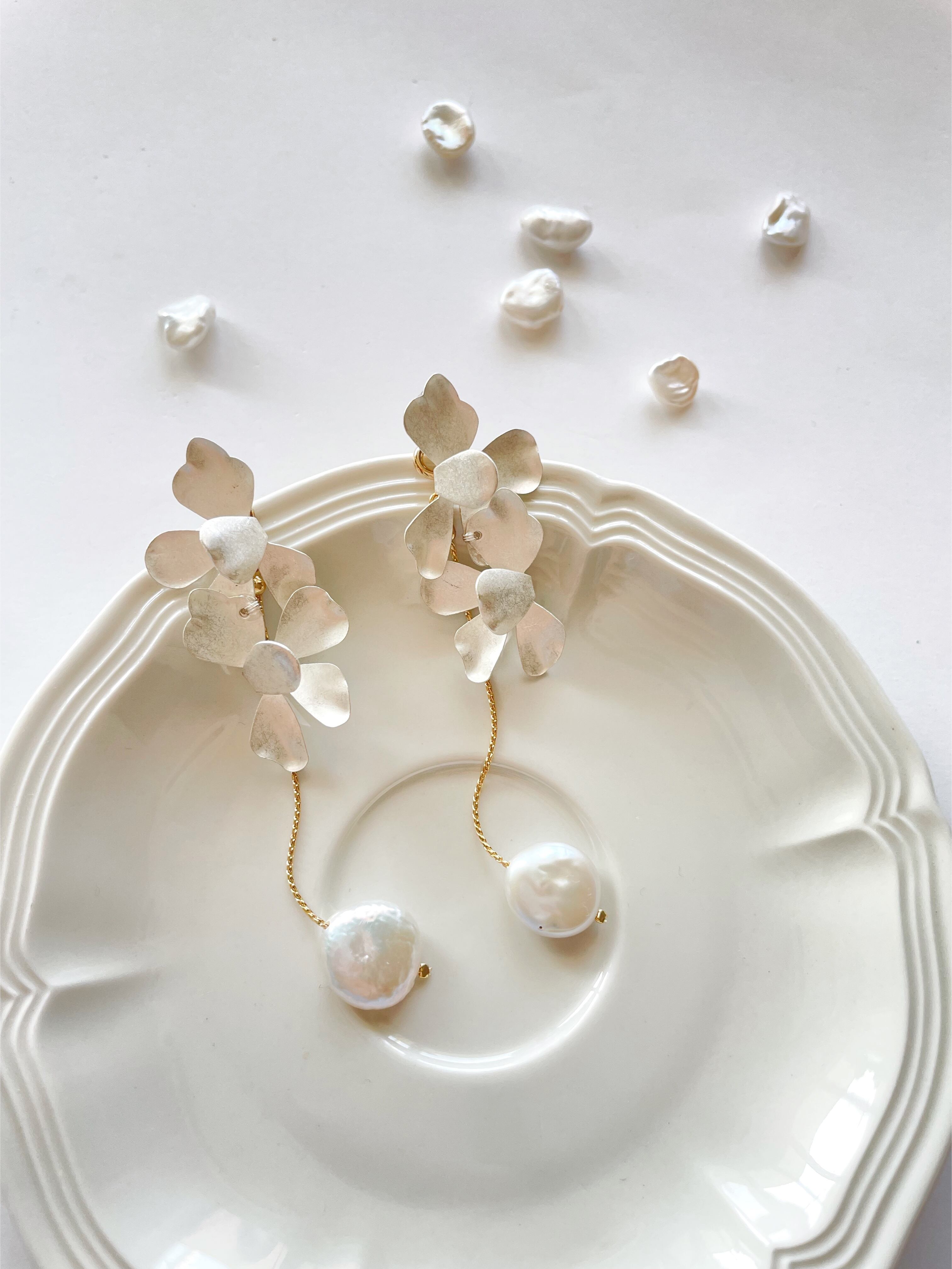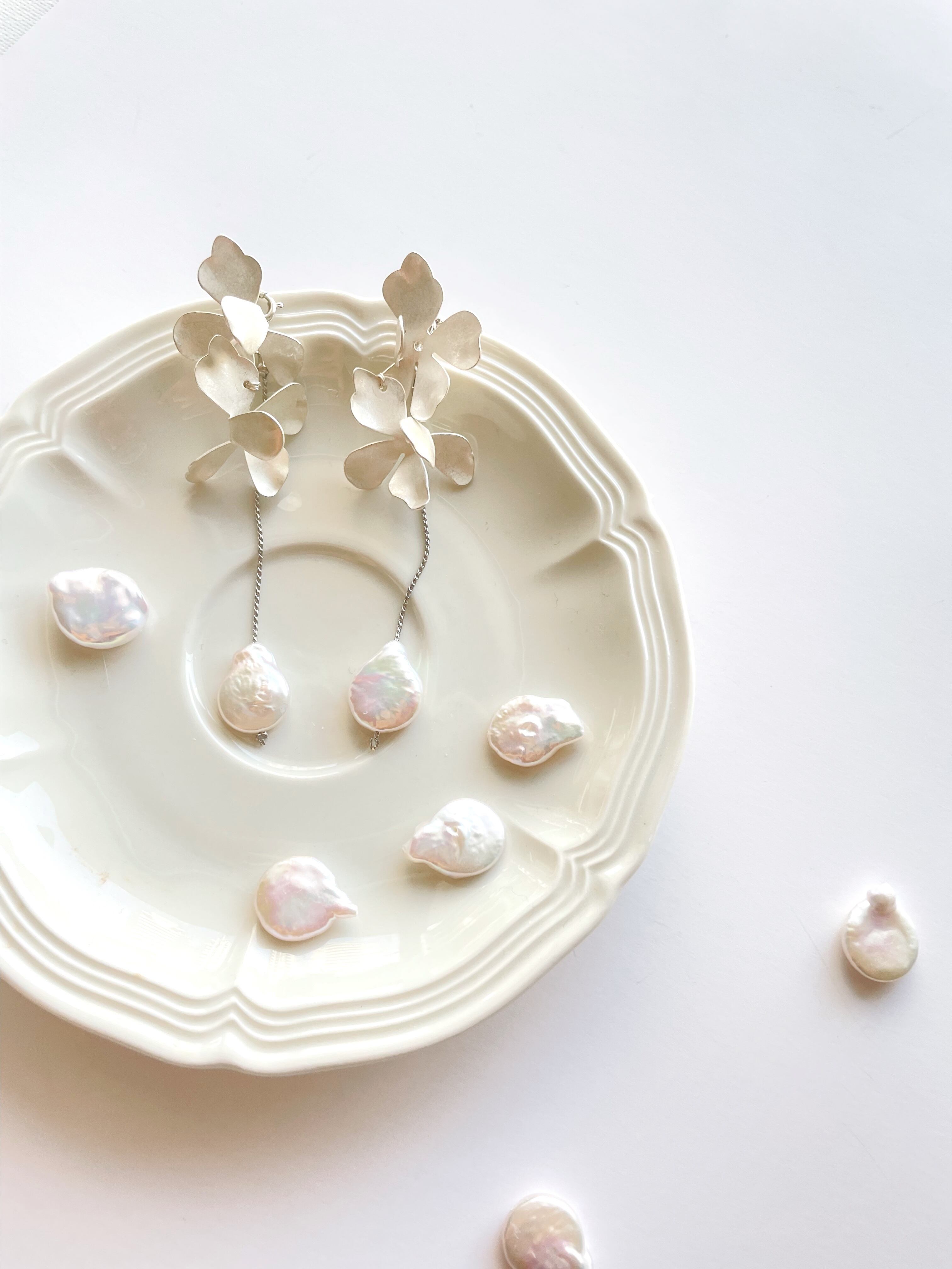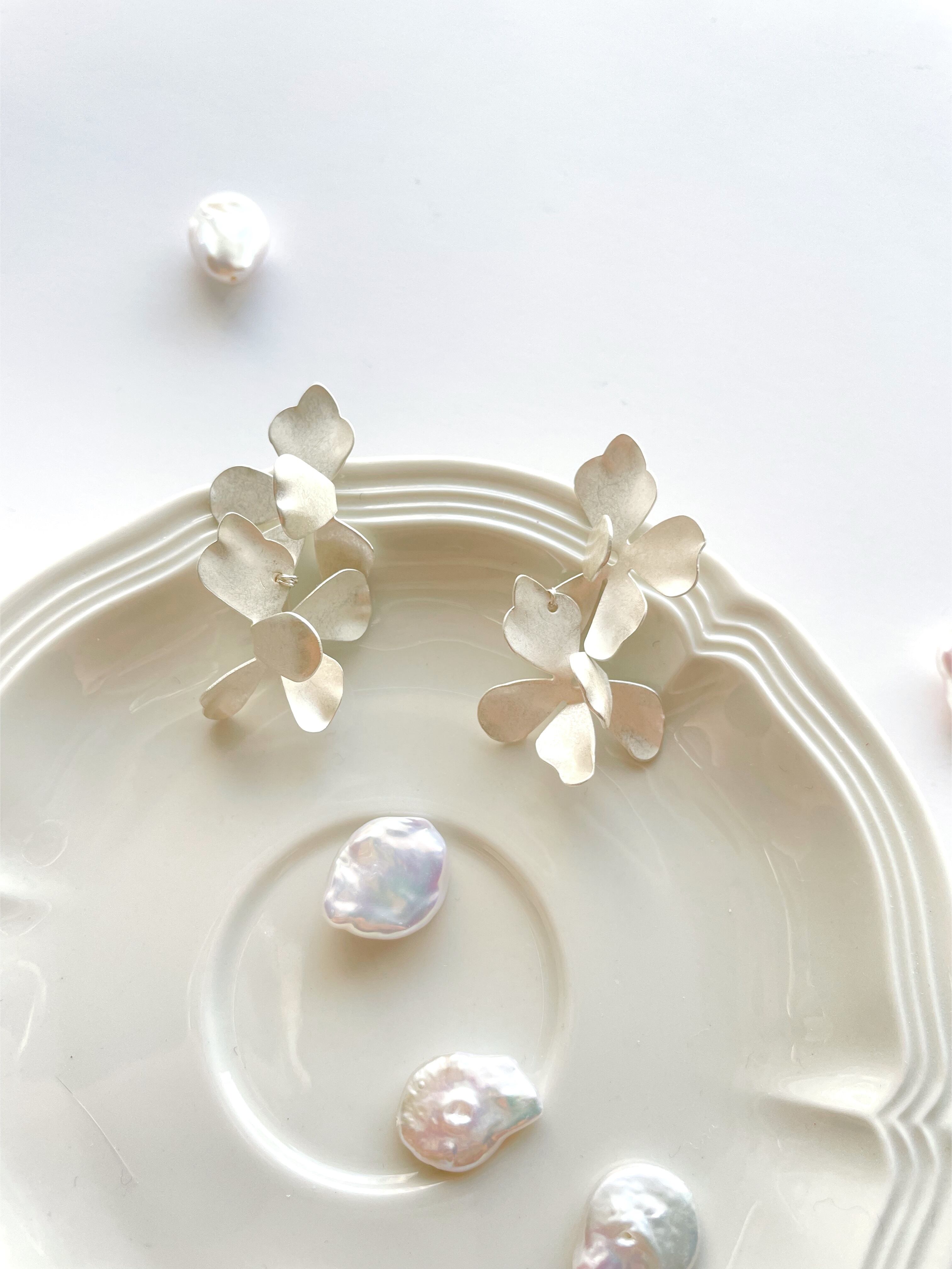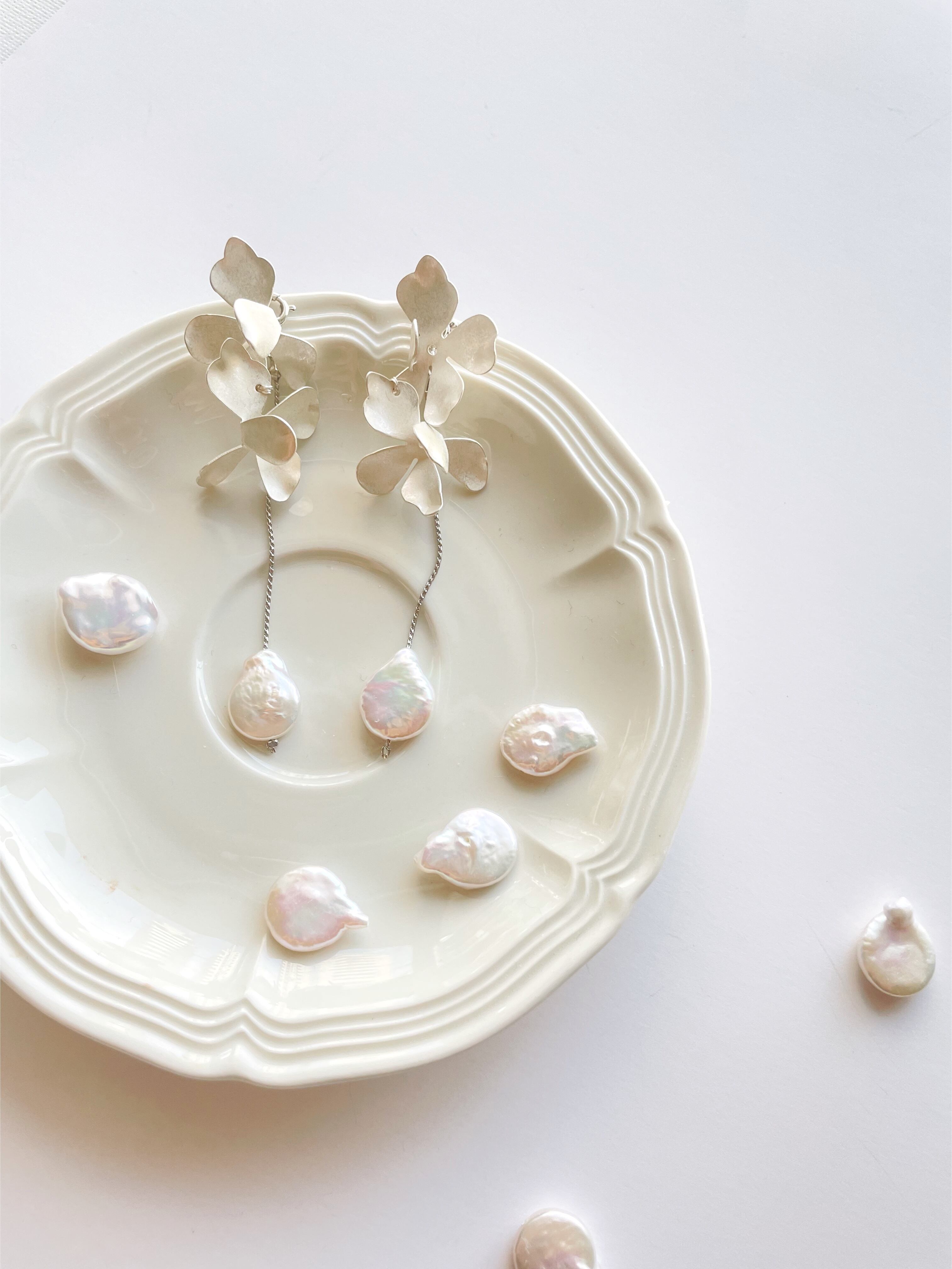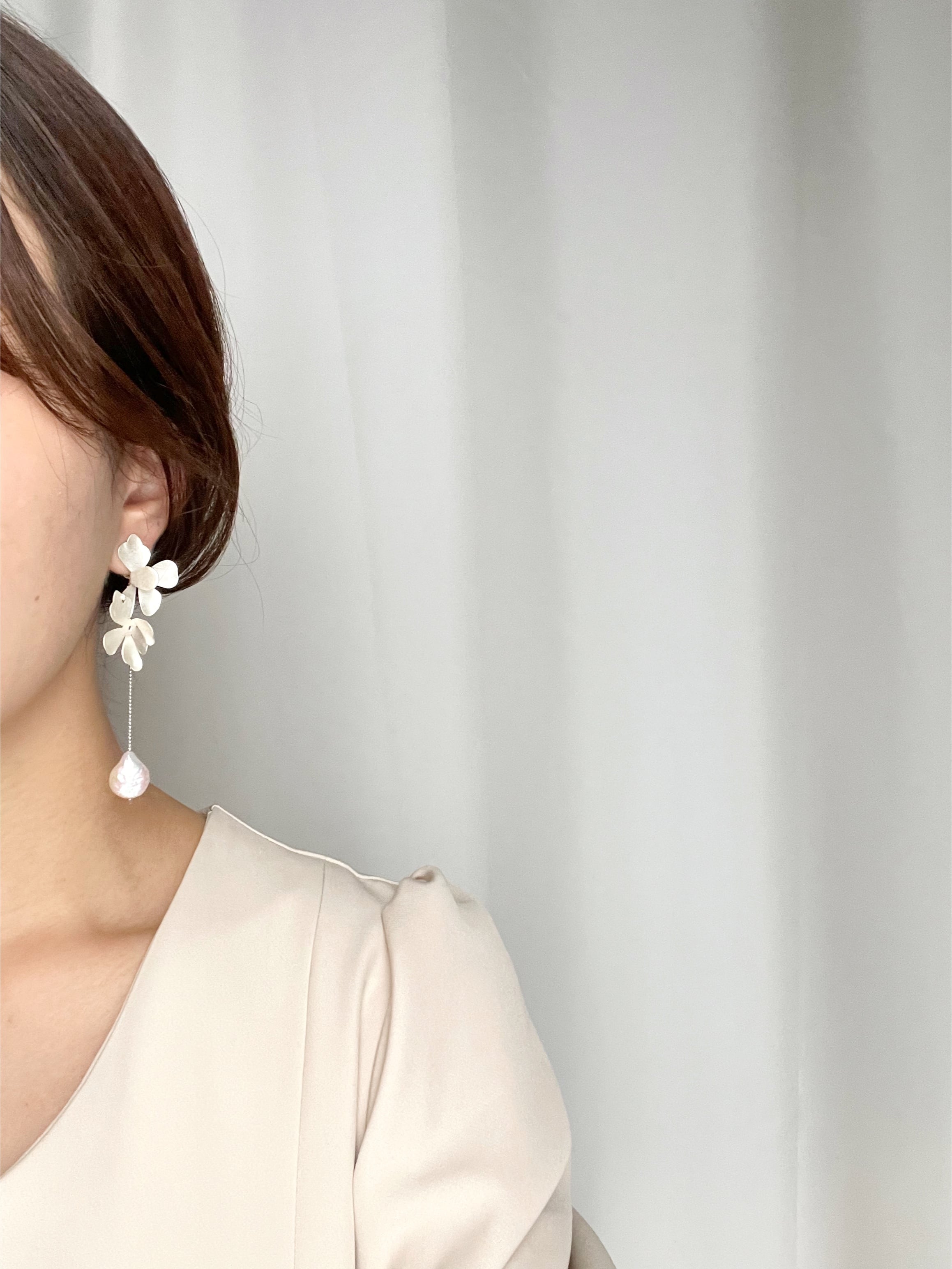 肌馴染みのいい艶を抑えた明るいシルバーのお色味なので、結婚式や前撮りはもちろん、普段使いもしやすいデザインとお色味です。