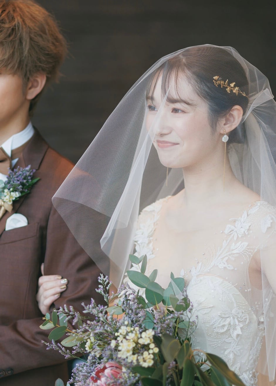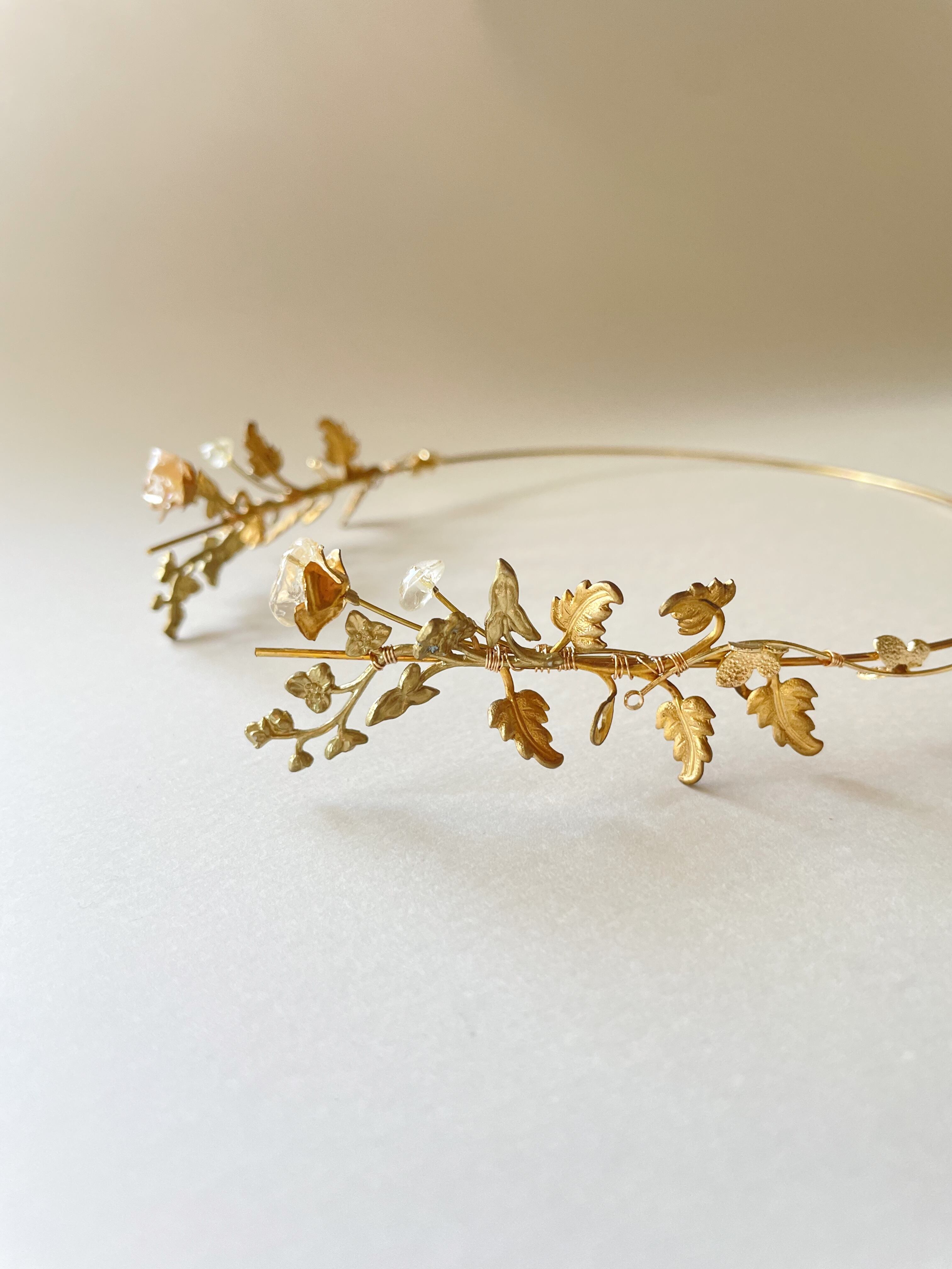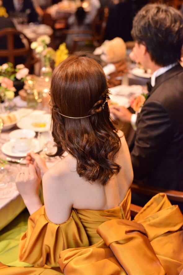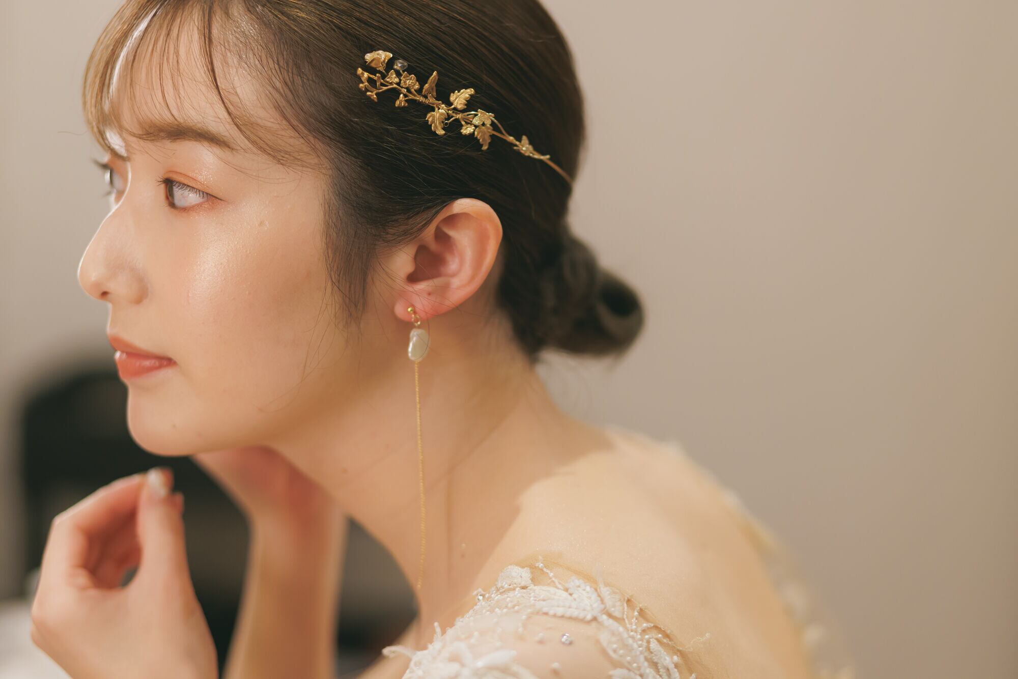 真鍮のアンティークゴールドのお色味は肌馴染みがよく、ナチュラルテイストなドレスとの相性もばっちり