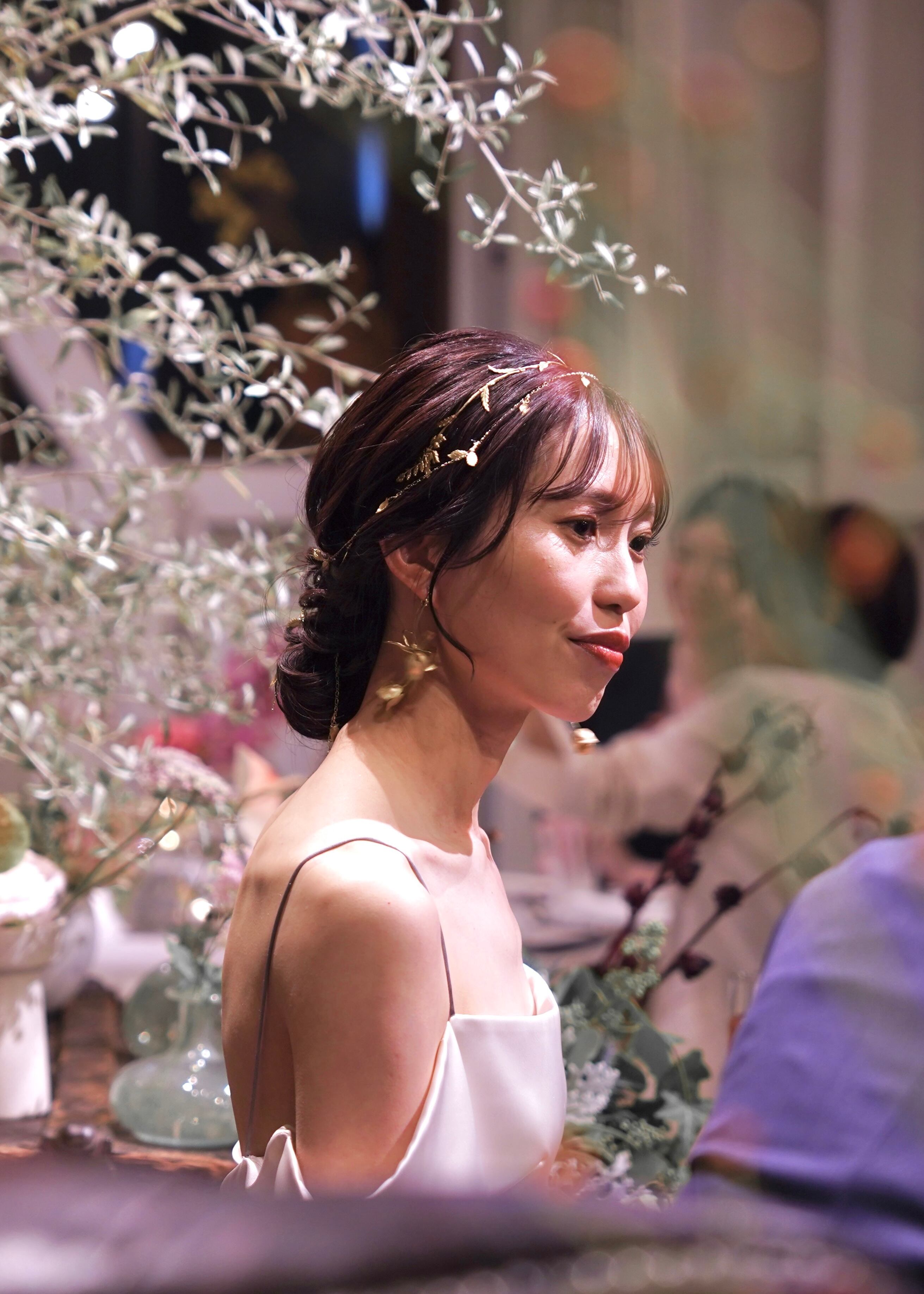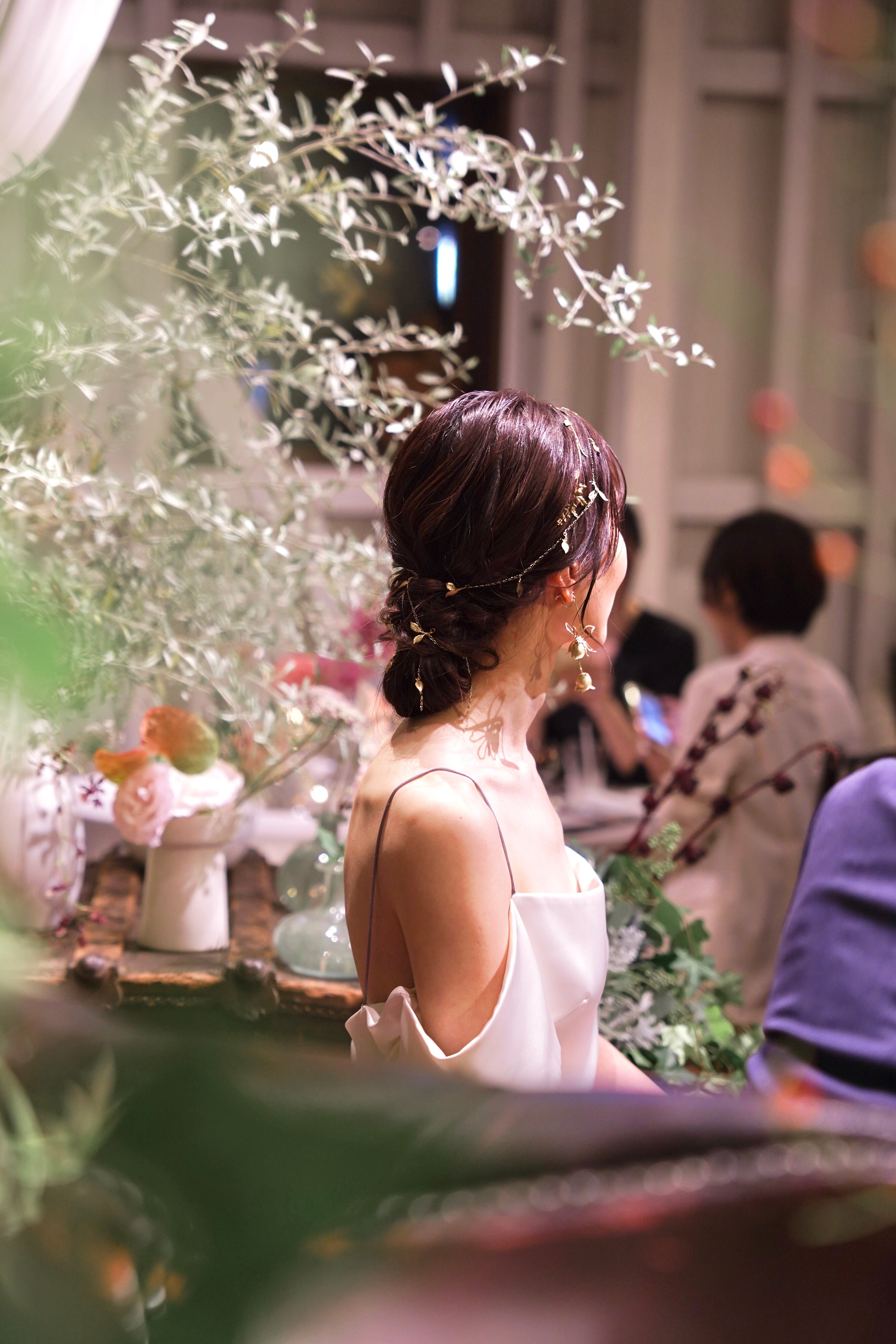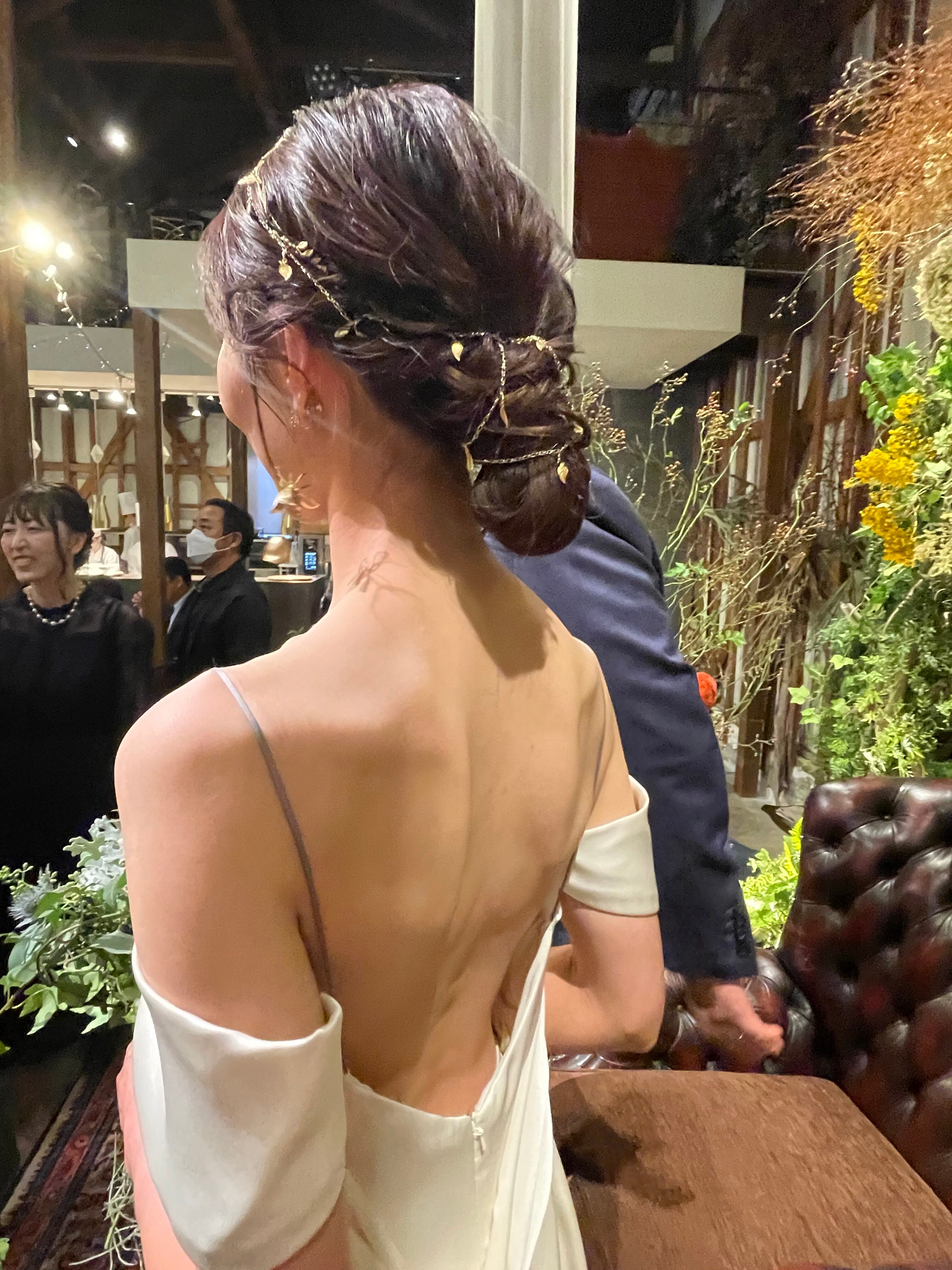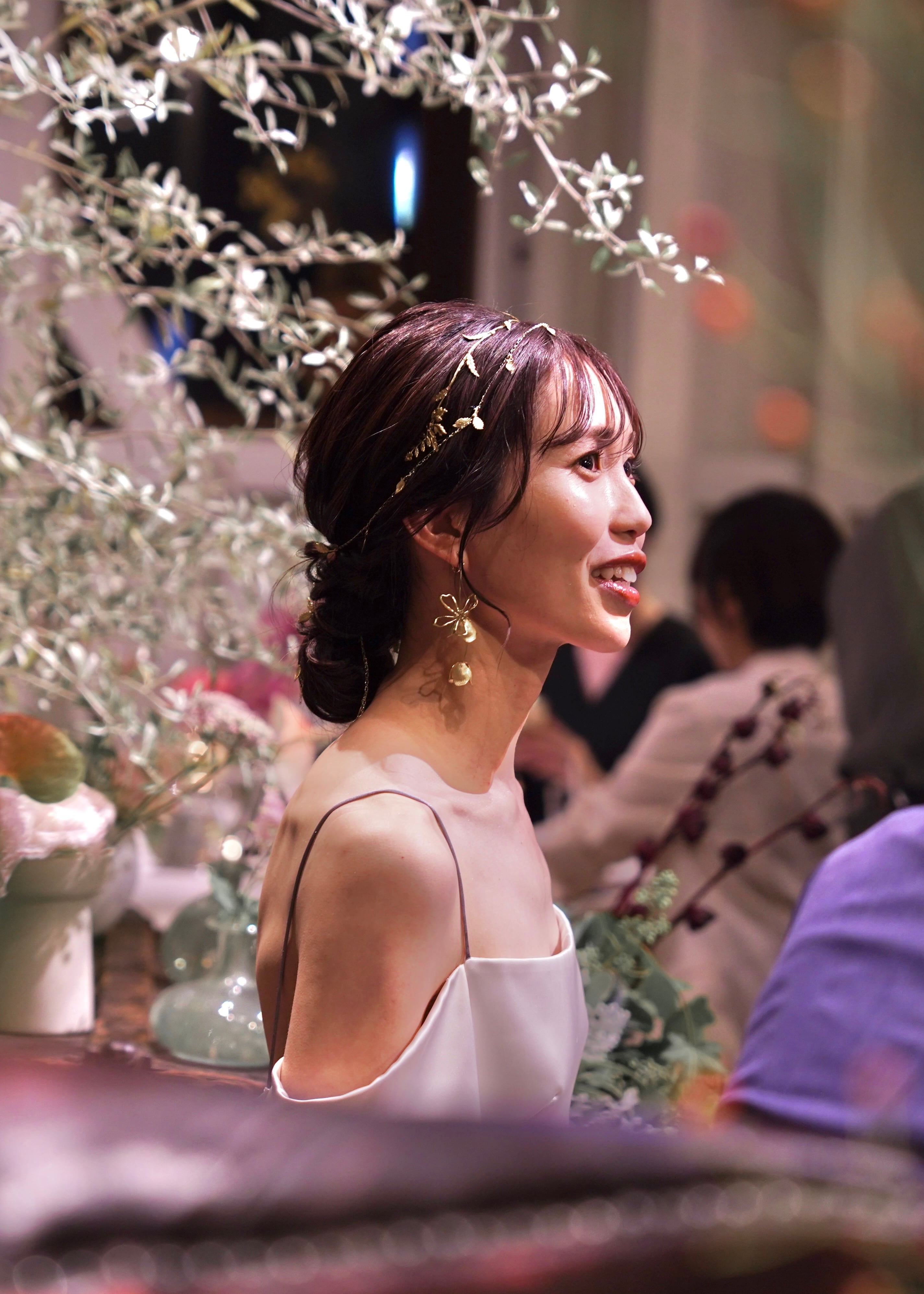 真鍮のアンティークゴールドのお色味は肌馴染みがよく、ナチュラルテイストなドレスとの相性もばっちり