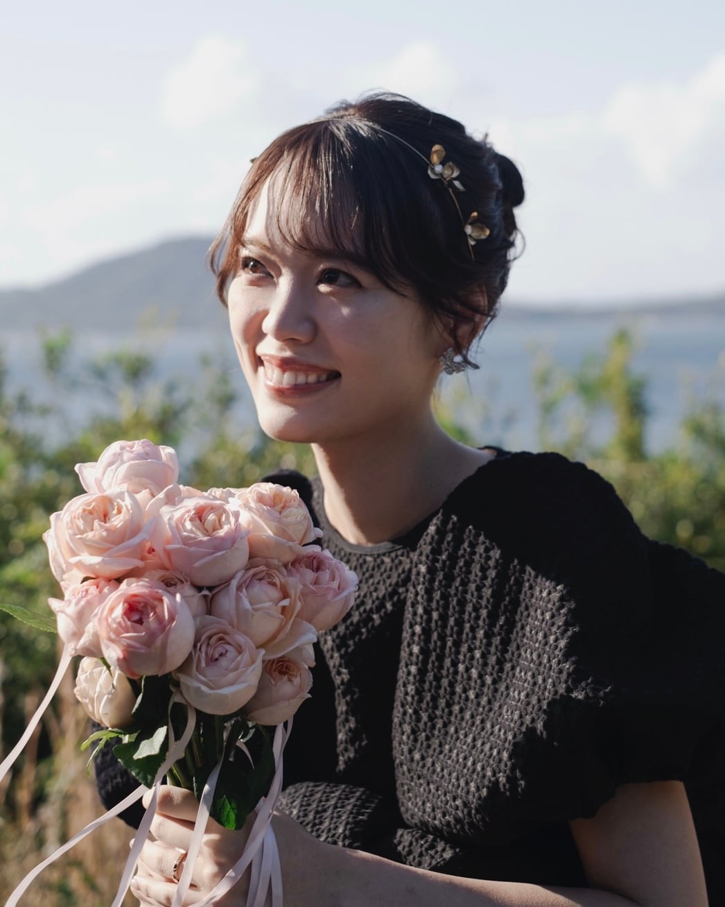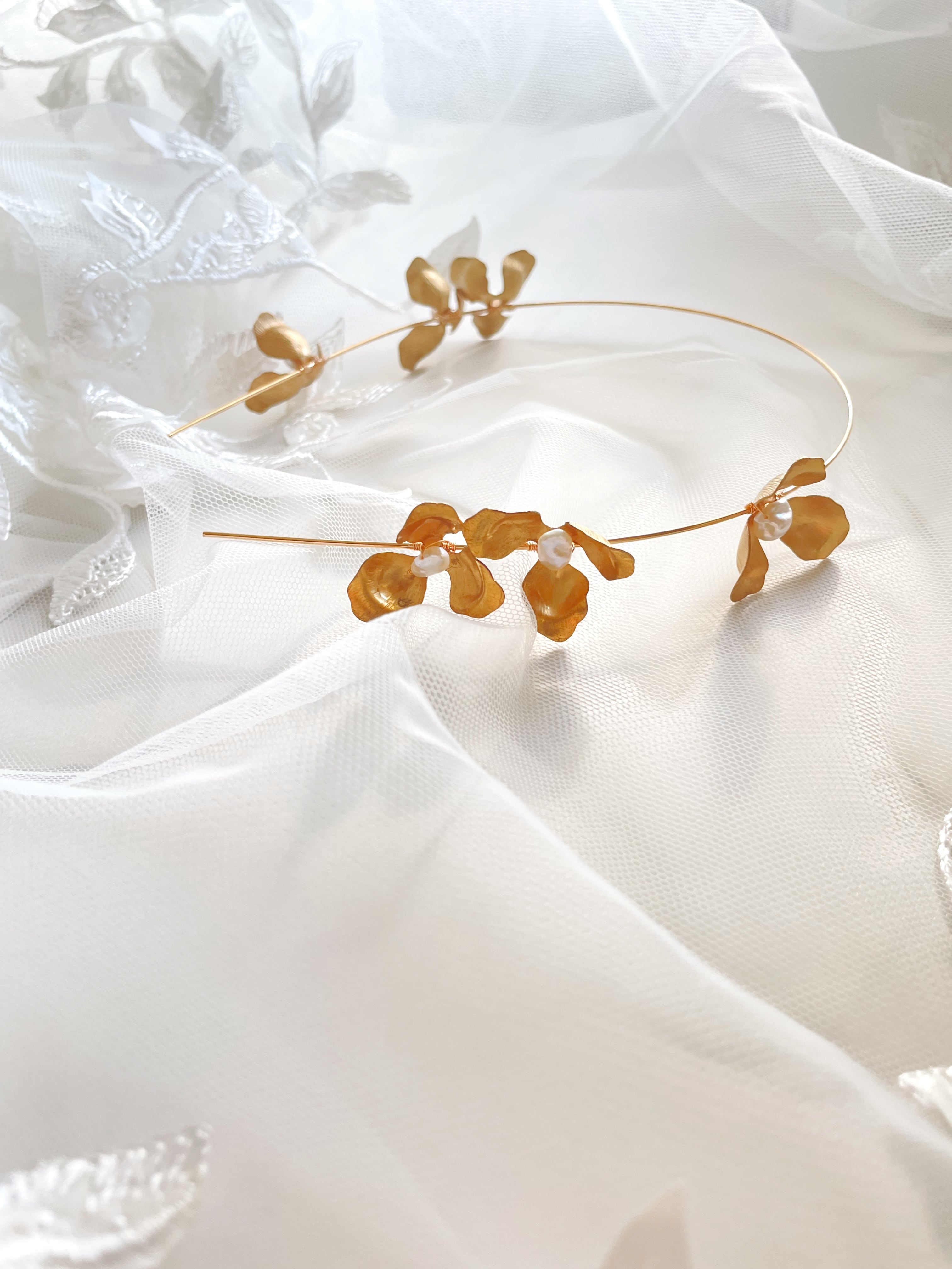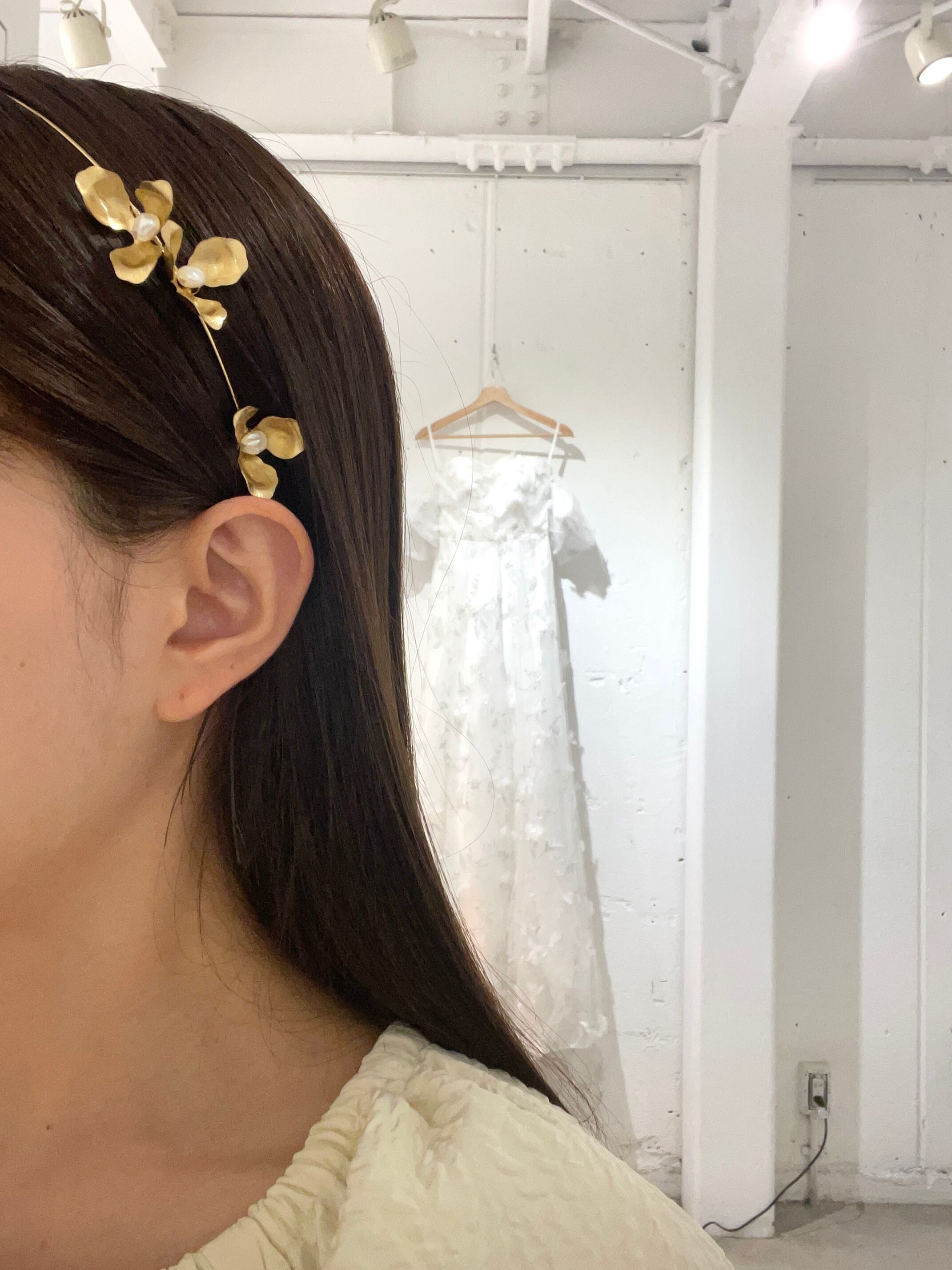真鍮のアンティークゴールドのお花は肌馴染みがよく、ナチュラルテイストなドレスとの相性もばっちり